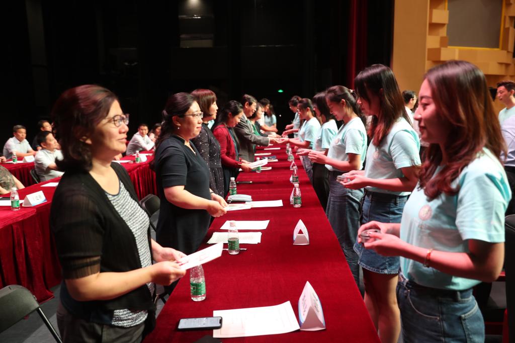 随后,研究生同学代表将自己手写的心意卡送给学校领导和老师,表达了真挚的祝福。老师们向新生回赠校徽,祝贺他们成为一名北语人,成为“小联合国”这个大家庭中的一员。开学典礼在悠扬的校歌声中圆满落幕。