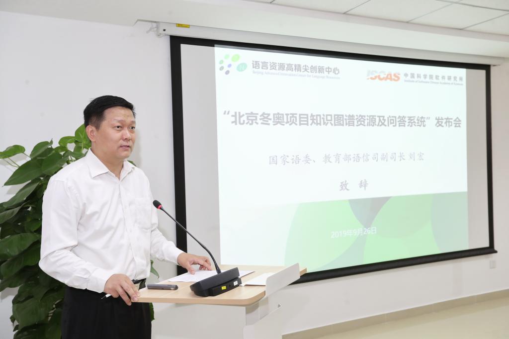 教育部语信司副司长刘宏致辞。他首先充分肯定了项目成果,该项目丰富并完善了冬奥知识问答服务,本次发布的“北京冬奥项目知识图谱资源及问答系统”,是落实2017年《北京冬奥会语言服务行动计划》的又一重要体现。他认为,要继续加强多方合作,在体制机制方面进行大胆探讨与创新,各相关部门要继续发挥应有职能,切实为2022年北京冬奥会创造良好环境,彰显中国语言的独特魅力。
