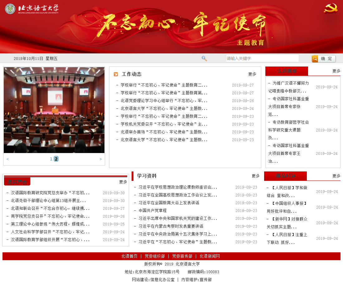 学校积极搭建线上线下学习宣传平台和载体,营造浓厚的主题教育氛围。充分利用线上学习宣传的强大优势,开设“不忘初心、牢记使命”主题教育专题网站,设有“工作动态”“基层声音”“先进典型”“学习资料”“媒体时评”五个专栏,旨在深入学习贯彻习近平总书记关于“不忘初心,牢记使命”的重要讲话精神,积极宣传中央及上级部门开展主题教育的重要精神和部署要求,及时报道学校主题教育活动的进展情况和师生反响体会,营造良好舆论氛围。官方微信推出“读懂中国”、“北语教师在海外”先进教师典型系列报道,聚焦北语人在教学科研上的先进事迹挖掘和宣传,及时反映学校主题教育活动进展成效、经验做法。积极发挥线下宣传阵地作用,制作宣传展板、横幅,更新宣传橱窗、LED屏等,在校内营造主题教育浓厚氛围,确保主题教育入人心、见实效。