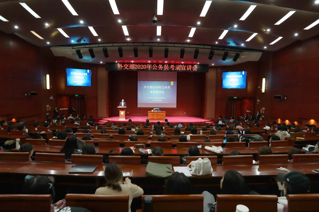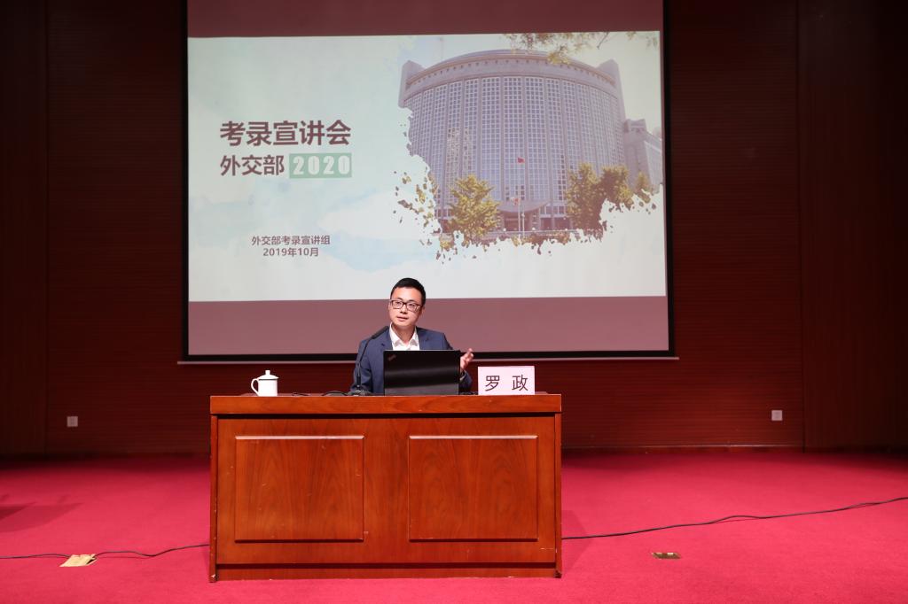 10月10日下午,外交部2020年公务员考录宣讲会在逸夫报告厅举行。我校1993级校友、外交部领事司领事保护中心常务副主任杨舒和外交部干部司考录培训处罗政分别作了精彩的报告与政策宣讲。考录宣讲会由学生处副处长王悦主持。