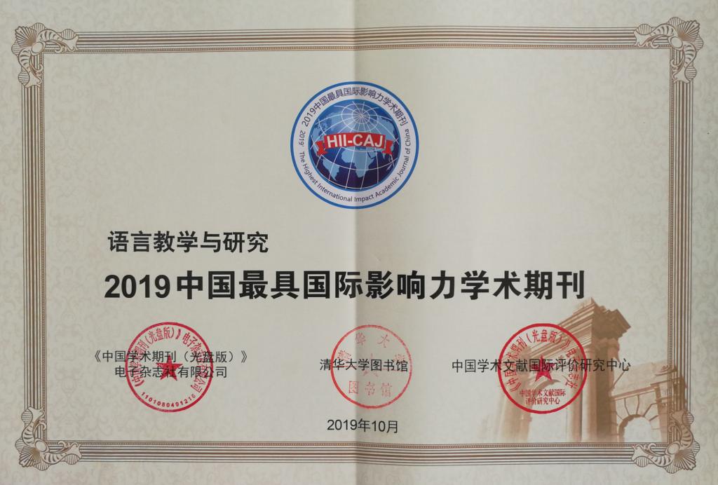 影响力指数(CI)是反映期刊在本学科期刊群中的学术影响力水平的重要指标。报告显示,《语言教学与研究》的影响力指数为714.837,列汉语语言学类期刊第三位,国际影响力指数为171.880,入选“2019中国最具国际影响力学术期刊(人文社会科学)”。这是《语言教学与研究》连续第七年入选“中国国际影响力TOP期刊(人文社会科学)”。