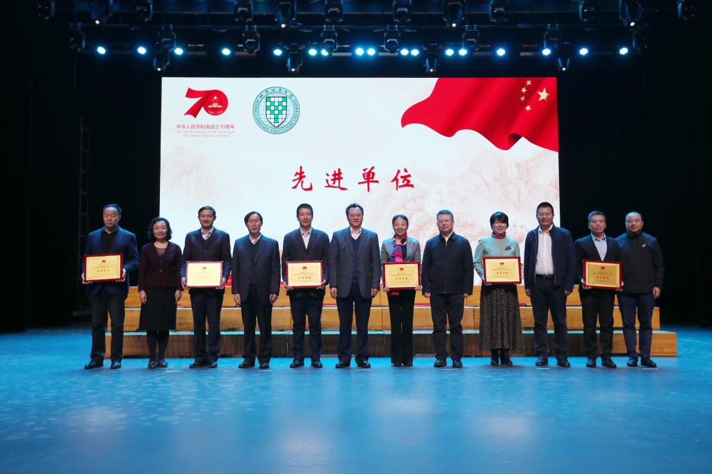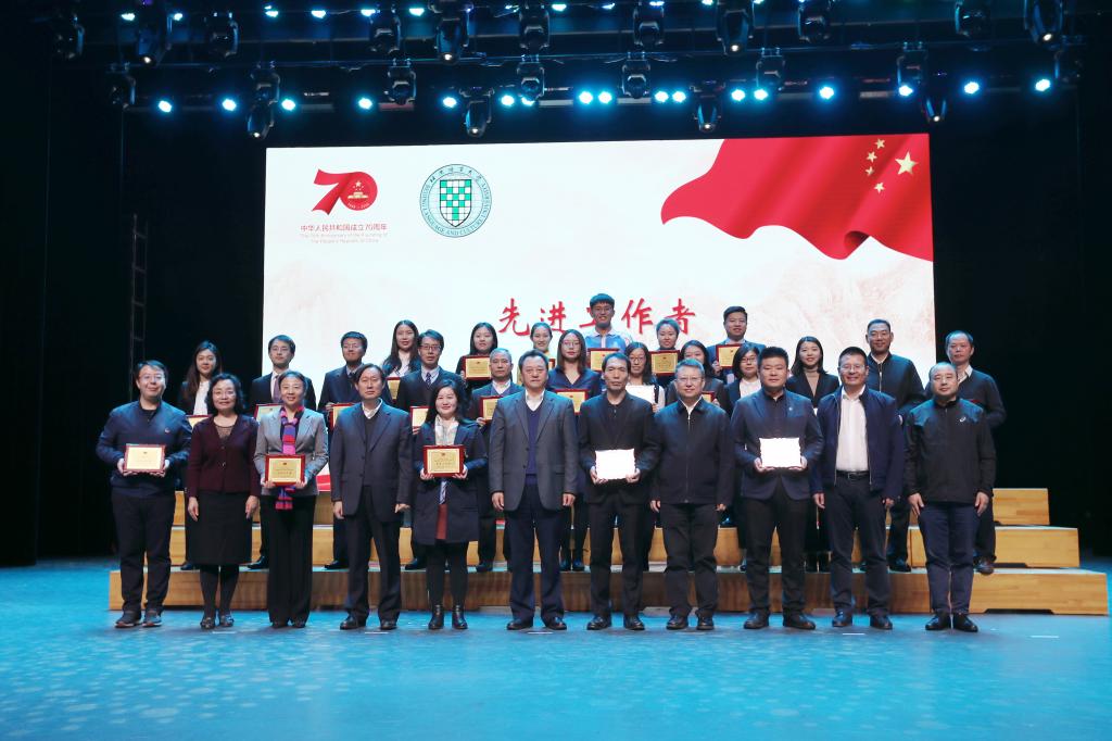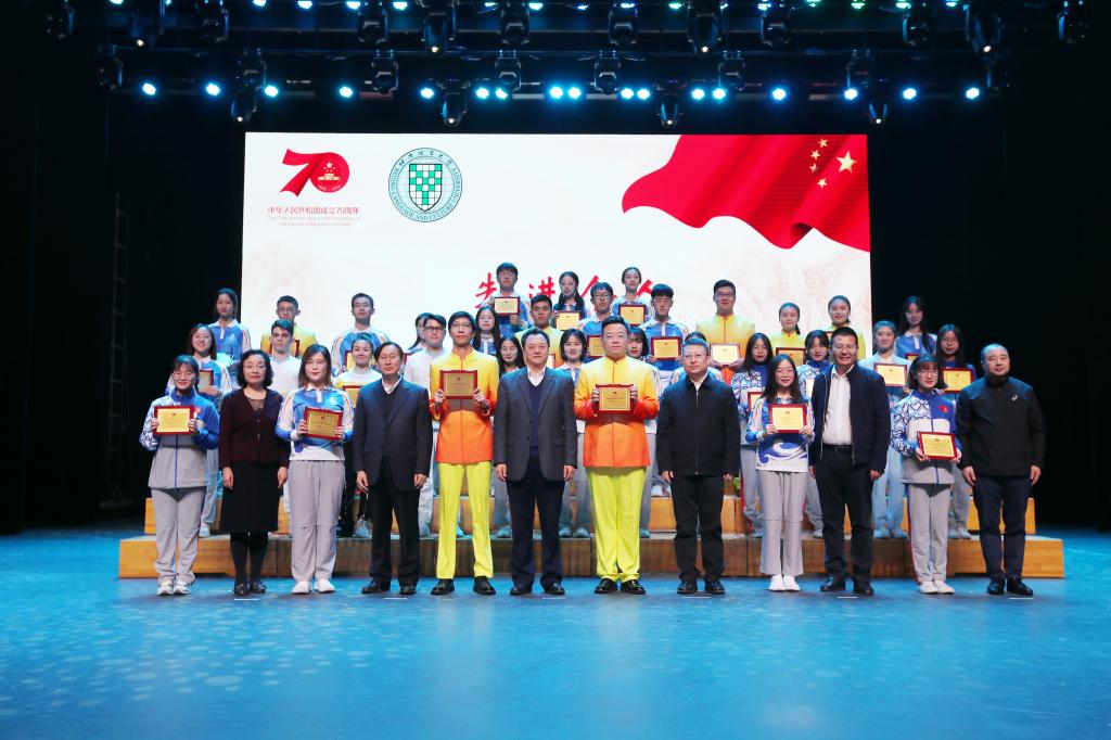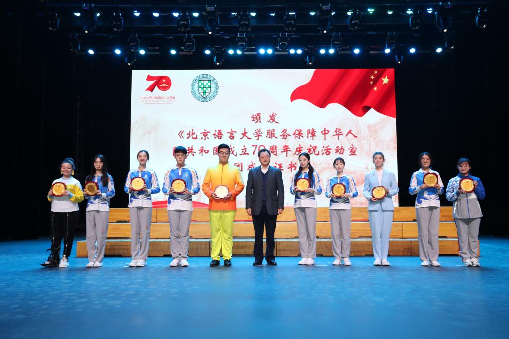 马贵生副书记宣读《中共北京语言大学委员会关于给予参加中华人民共和国成立70周年庆祝活动师生嘉奖的决定》。学生处、港澳台办公室、国际学生管理处、校团委获得“北京语言大学服务保障中华人民共和国成立70周年庆祝活动特殊贡献奖”;外国语学部、人文社会科学学部、信息科学学院、商学院、艺术学院、语言康复学院获评“优秀组织单位”;王伟光等25名工作人员获评“校级先进工作者”;体育教学部朱凌泽、艺术学院金珂宇获评“优秀指导教师”;学校办公室、党委宣传部、党委保卫部、教务处、体育教学部、校医院、后勤服务集团获评“先进单位”;杨一凡(研究生)、刘诗朗(中国香港)、嘉娜尔(哈萨克斯坦)、李木子(本科生)等40余名中外学子获得“先进个人”。商学院辅导员王慧媛、学生处张鑫在工作中表现突出,被上级授予“市级先进个人”。