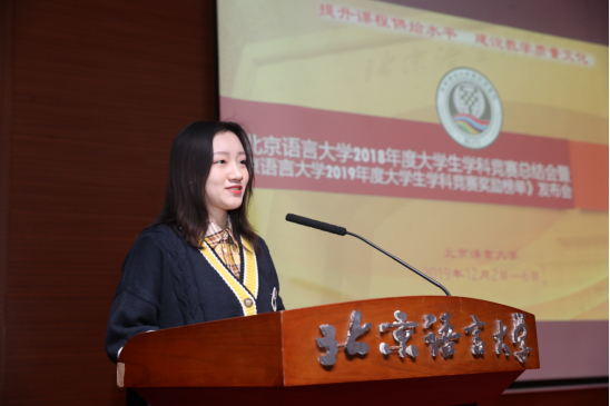 外国语学部曾姝媛与商学院级孙小涵两名同学作为获奖学生代表发言,在展示自己获奖成果之余,表达了对指导教师的感谢之情。同时,也对各自参与的赛事流程及获得奖项的经验进行了说明,以此来鼓励广大学生都能参与到学科竞赛中,锤炼能力,提高水平。