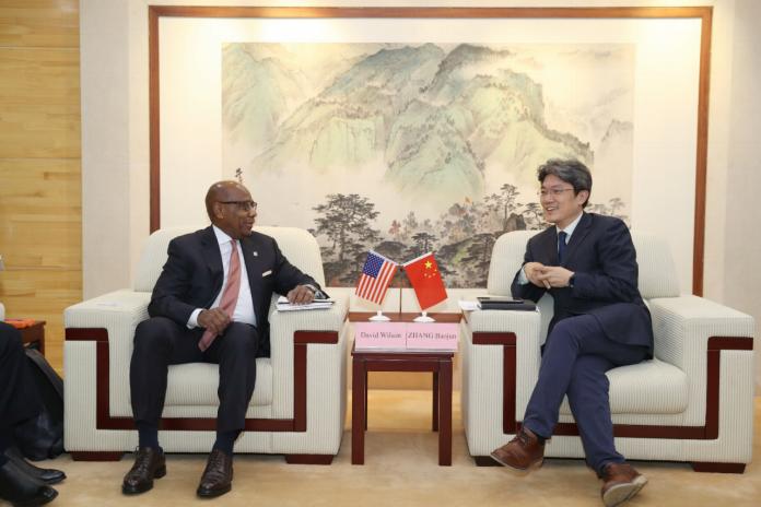 戴维·威尔逊校长感谢北语对代表团一行的欢迎,他说自从上次访问之后,对北语印象深刻,因此这次带领另外两所大学的校长访问中国,第一站就选择了北语。他向张宝钧副校长介绍了美国传统非裔大学的历史以及过去与中国间开展的合作情况,并邀请其他两所大学的校长介绍了各自学校的情况。他说,美国内战结束后,黑奴得以解放,他们的孩子如何获得接受教育的权利便成了亟待解决的问题,因此美国传统非裔大学应运而生。多年来,美国传统非裔大学已经发展成为一个很大的教育体系,包括100多所独立的大学或学院,并且深知国际化的重要性,希望为学生提供了解世界、了解中国的机会。因此,希望通过访问北语促成双边合作关系,开展学生交流、教职工交流等合作项目。