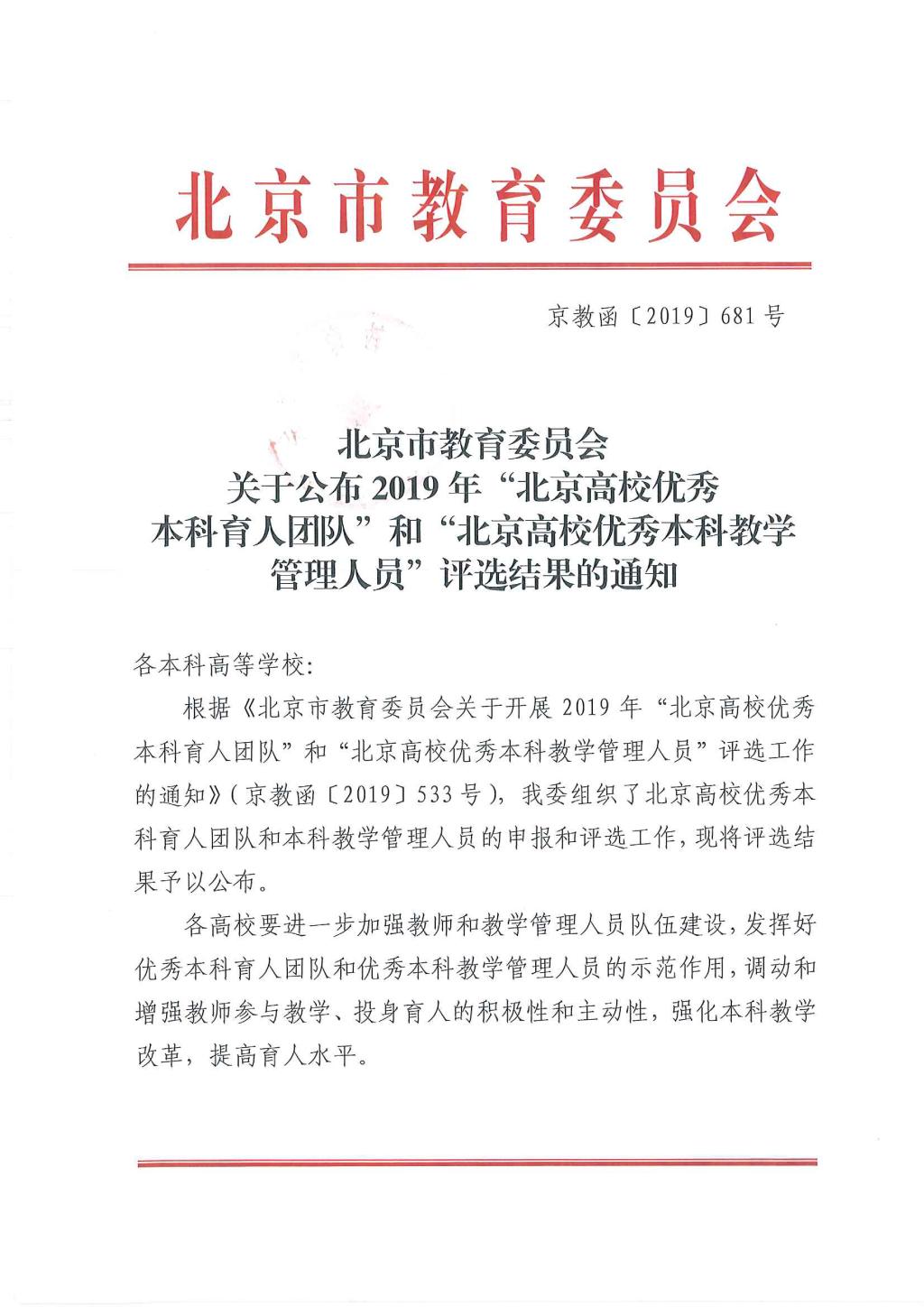 2019年11月,根据《北京市教育委员会关于开展2019年“北京高校优秀本科育人团队”和“北京高校优秀本科教学管理人员”评选工作的通知》(京教函〔2019〕533号)要求,北京市教委组织开展了申报和评选工作,经北京地区高校自主申报、市教委审定并公示后,最终遴选出40个“北京高校优秀本科育人团队”和40名“北京高校优秀本科教学管理人员”。