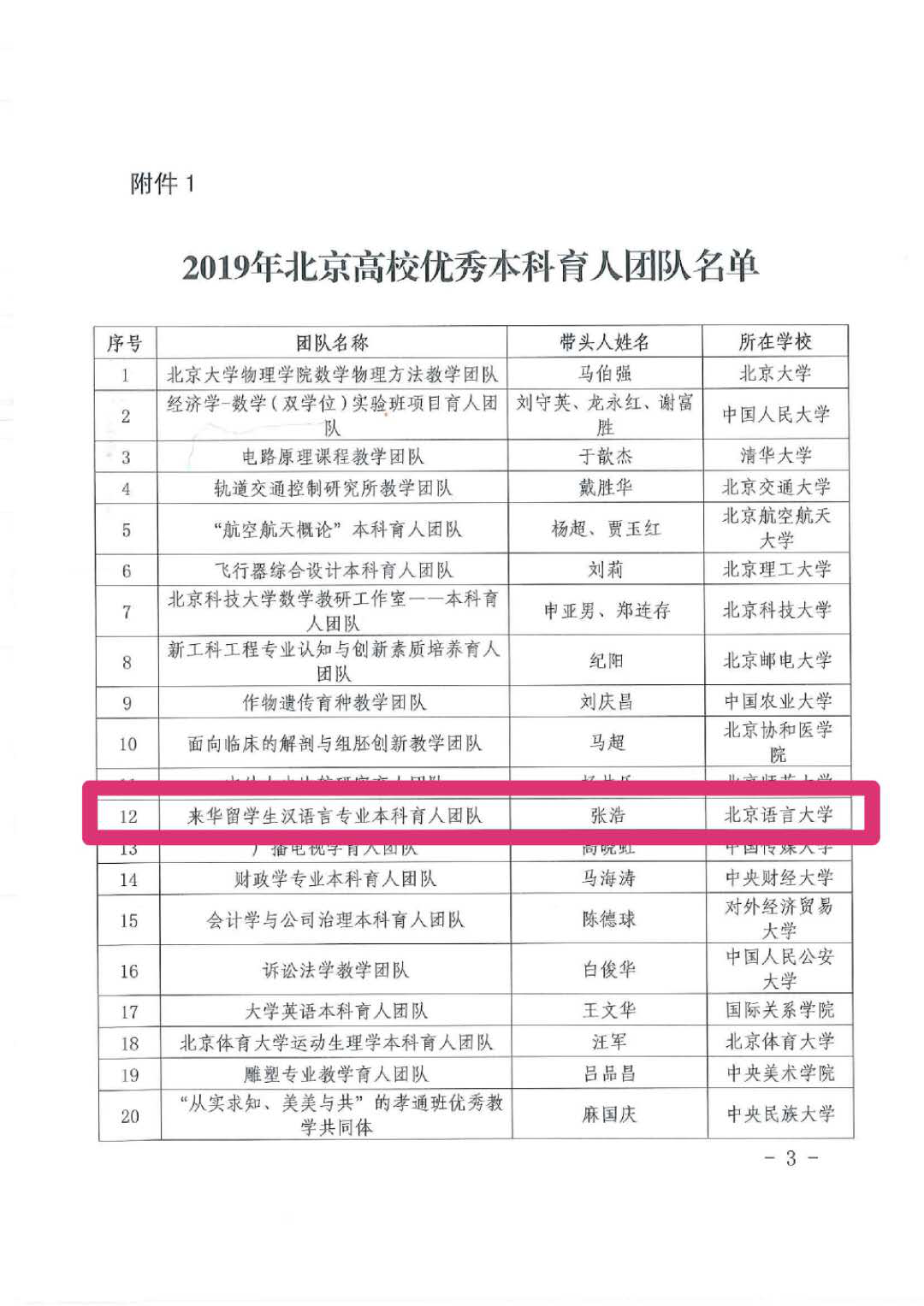 12月30日,北京市教育委员会公布2019年“北京高校优秀本科育人团队”和“北京高校优秀本科教学管理人员”遴选结果,我校来华留学生汉语言专业本科育人团队荣获“北京高校优秀本科育人团队”称号, 为我校深化教育教学改革,提升教师团队教学能力的过程中发挥了模范带头作用。