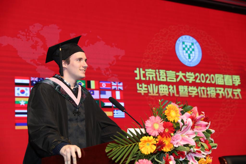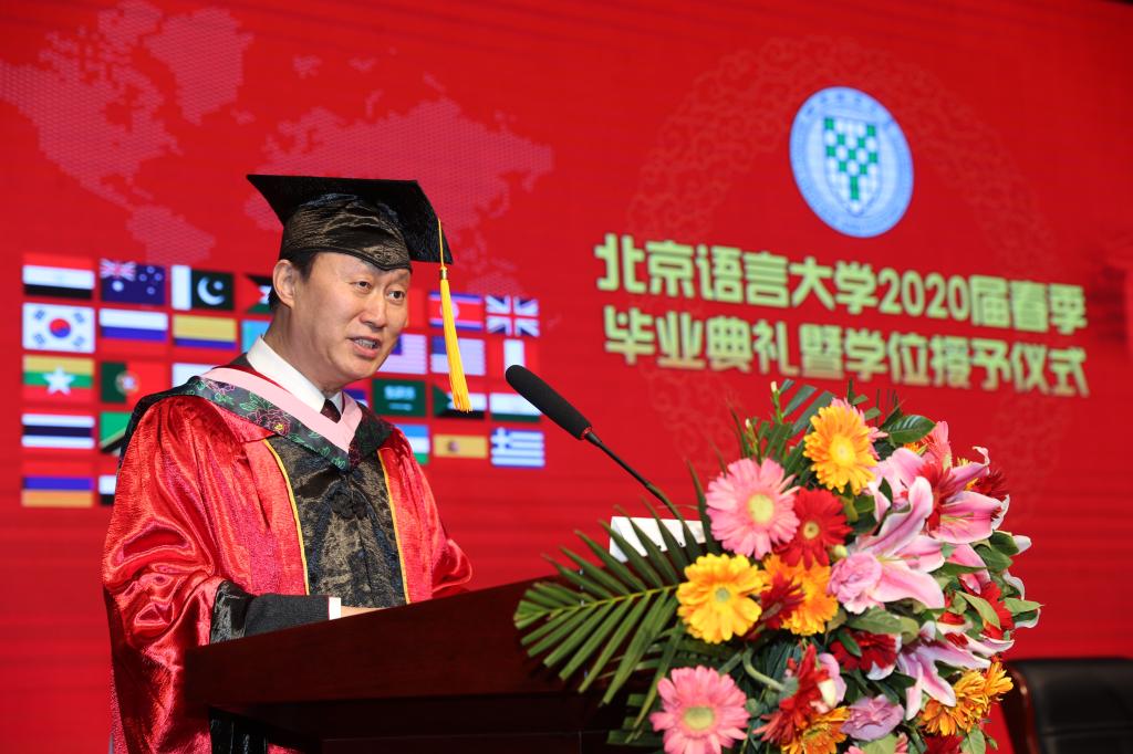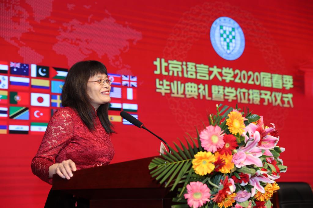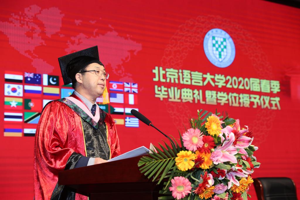 张旺喜副校长宣读了《北京语言大学关于表彰2020届春季优秀毕业生的决定》,刘大树、蔡英英、汤家杰等10名本科生荣获“优秀毕业生”称号。