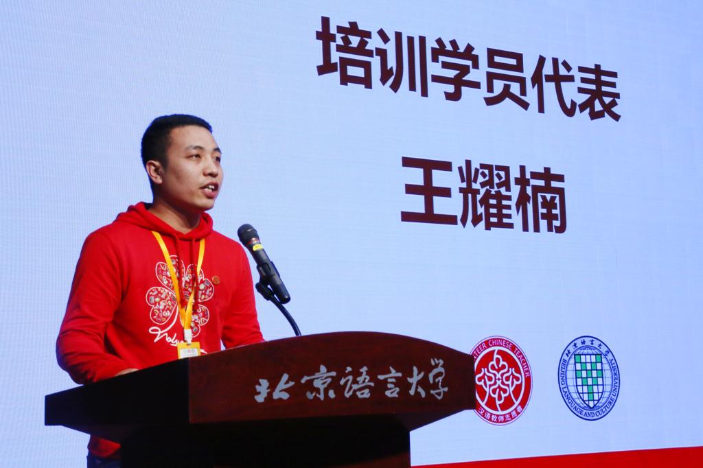 培训学员代表王耀楠代表全体学员向孔子学院总部及北京语言大学的领导老师们致以最真诚的谢意。他以自己与汉教的故事表达了对汉语教师的初心的理解与坚持。他表示,在作为汉语教师的同时,他们同样是传播中国声音的使者,应时刻不忘初心、牢记使命,做一名合格的汉教事业继承者、一名努力的中国故事讲述者。