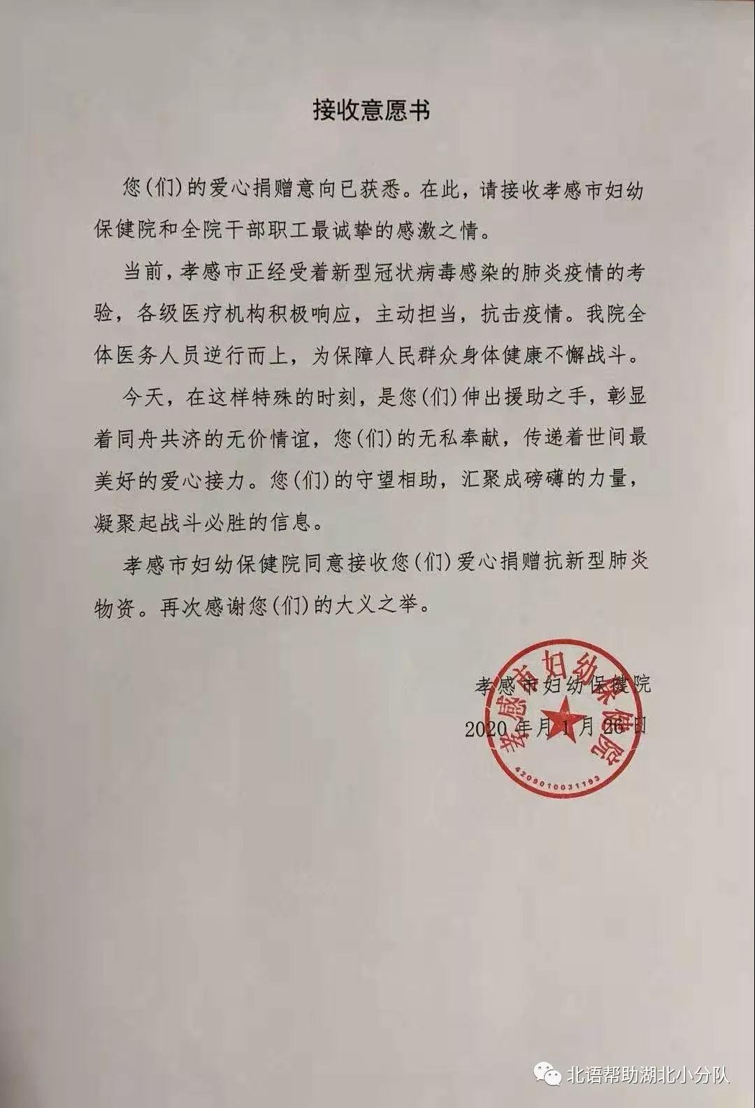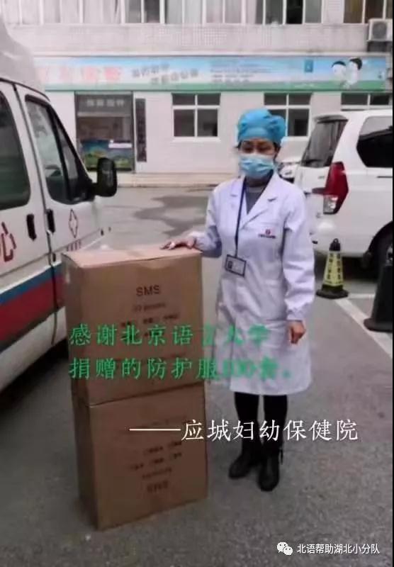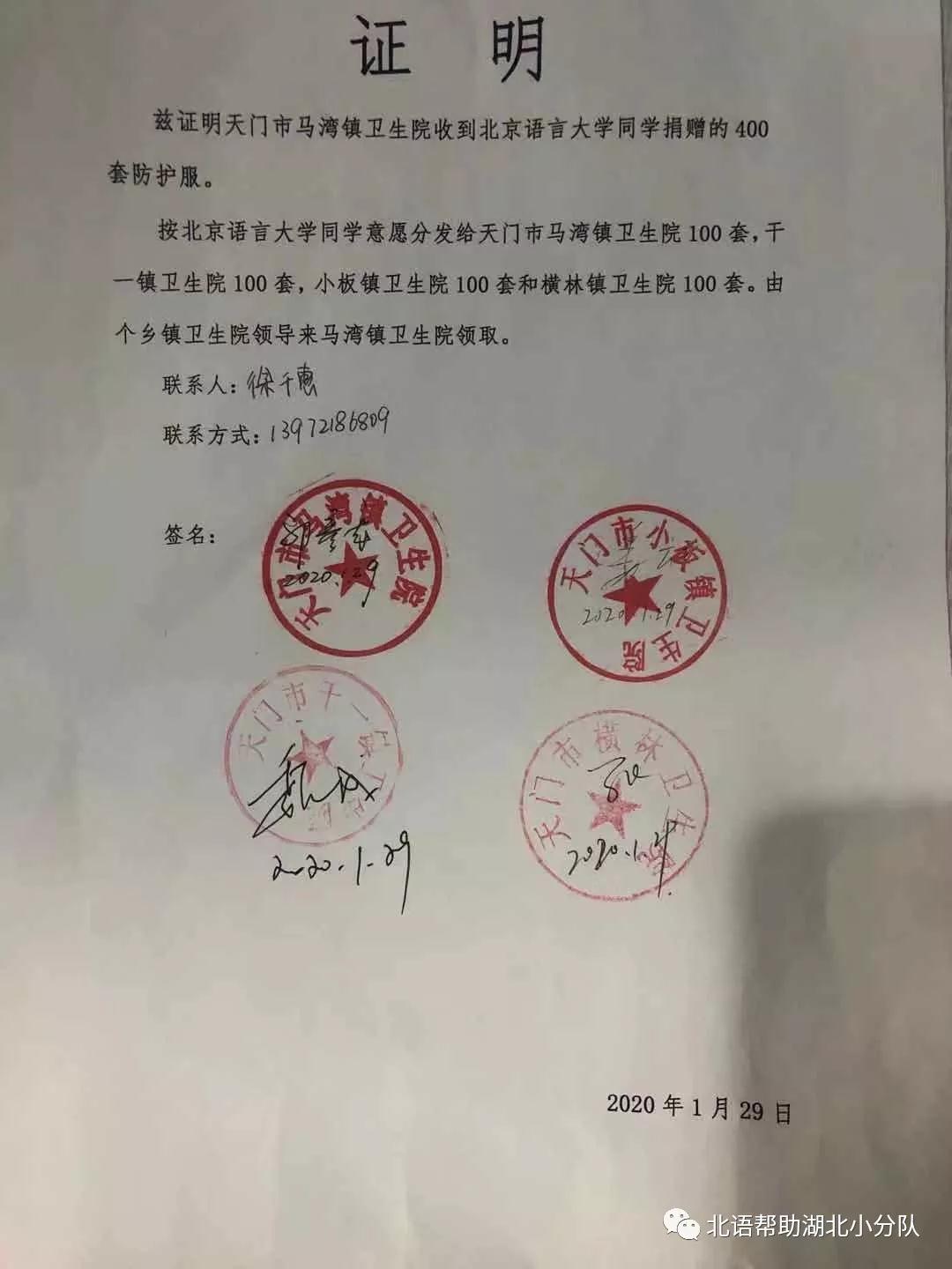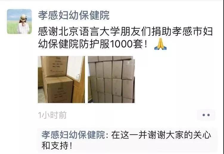 “我们收到了北京语言大学朋友捐赠的防护服1000套。” “感谢北京语言大学,我们收到了你们捐赠的400套防护服。”1月27日晚、1月29日下午,北语人捐献给湖北省孝感市妇幼保健院的1000套防护服,捐赠给湖北省天门市马湾镇卫生院、干一镇卫生院、小板镇卫生院、横林镇卫生院四个卫生院的400套防护服被成功接收。北语人捐赠的千余套防护服已经用在了疫情第一线,助力湖北打赢疫情防控阻击战。