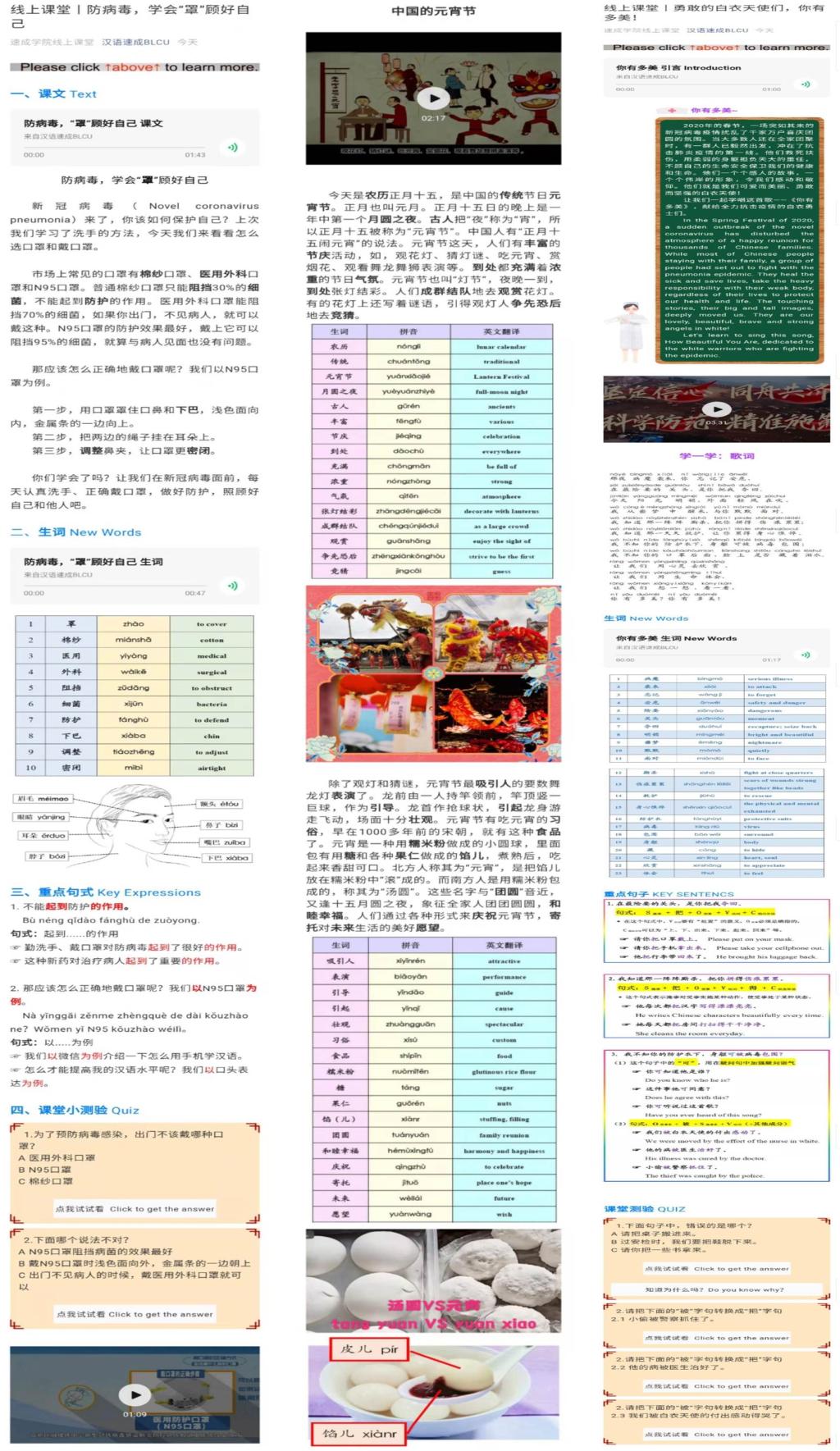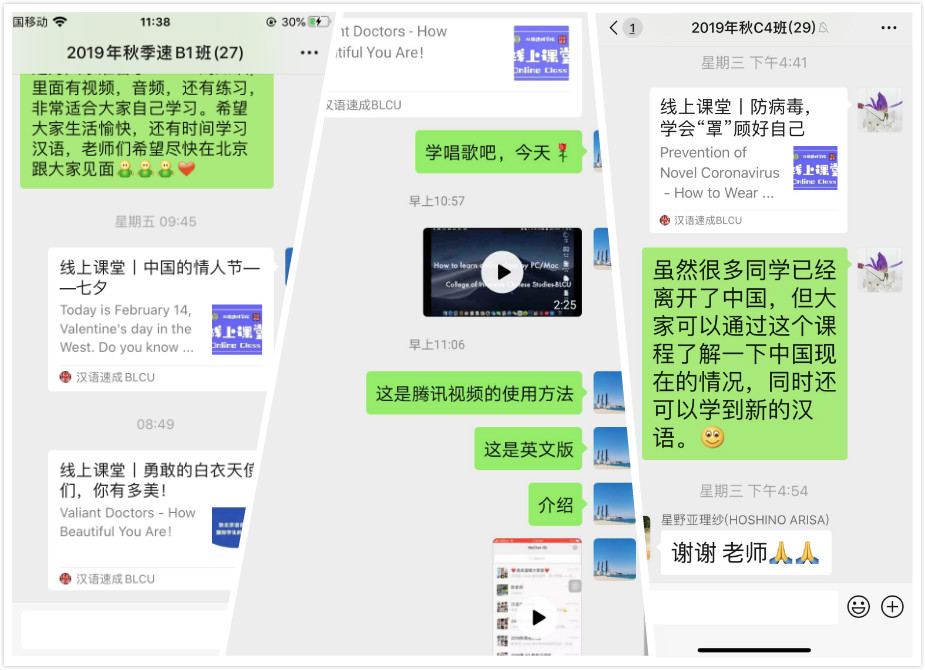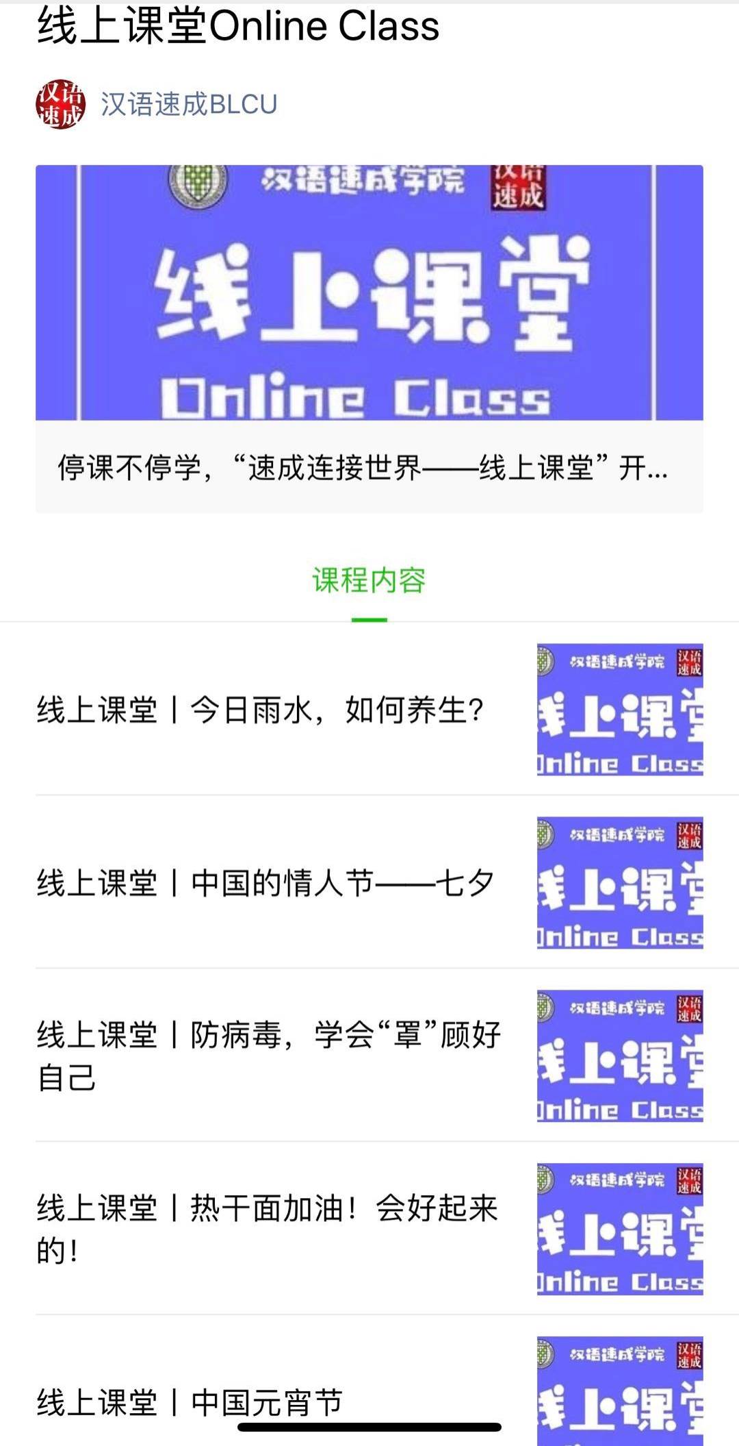 中华文化国际传播中心主任迟兰英、汉语速成学院院长苏英霞亲自担任线上课堂小组组长,岳岩老师任副组长,组员包括陈闻、蔡建永、蔡楠、吴霄岳、魏耕耘、于璐、周静婷等七位老师。线上课堂主要面向分散在世界各地的速成学院毕业生,其中包括部分春季学期已经报名的速成准新生,教学内容包括汉语学习、中国文化和强身健体三大版块。线上课堂小组在课前进行了多次讨论,他们从学习者的学习需求、兴趣爱好和关注点出发,精心编写教文,突出知识性、实用性和趣味性,精挑细选与课文密切相关的视频,为方便同学们自学和检验学习效果,老师们还专门给每课的课文和生词录制了音频、设计了互动小测试,并以生动活泼的形式予以呈现。线上课堂每周一、三、五按主题进行新课推送,二、四、六则是复习巩固与作业答疑。第一期于2月7日推出,目前已经推出了七期。