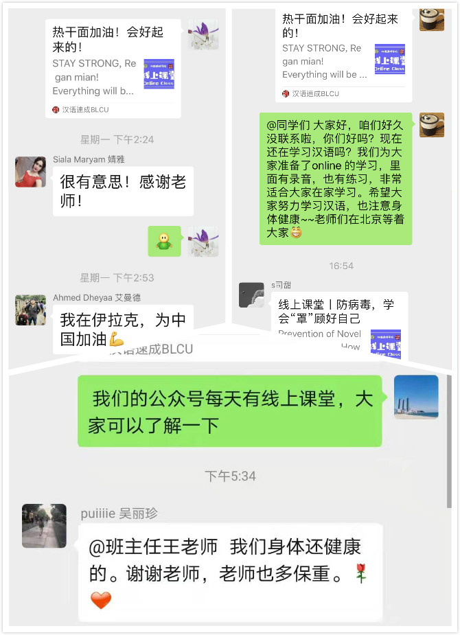 “青山一道同云雨,明月何曾是两乡。”在抗击疫情的关键时期,汉语速成学院的每一个人,从党员到群众,从领导干部到普通教师,大家都严格听从学校安排,始终以高度的责任感和使命感投入疫情防控工作,多措并举、想方设法做好留学生的各项工作,在非常时期开展的独具创意的教学活动,切切实实起到了抗疫情、促健康、保稳定的积极作用!非常之日,非常之爱。教育无他,唯爱与责任。衷心希望“速成连接世界——线上课堂”,能陪伴每一位远方的学生健康、开心地度过这段非常时期,学有所得,学有所获,当然我们更期待能与他们早日在学校的课堂上相见!
