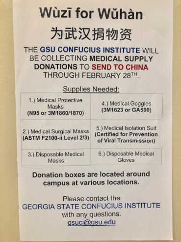 佐治亚州立大学孔子学院作为中美文化交流的桥梁,自疫情发生以来积极发挥在亚特兰大当地的影响力,协同各方力量开展善款和物资的募捐活动,以实际行动为抗击疫情贡献力量,支援国内高校医院的防护工作。