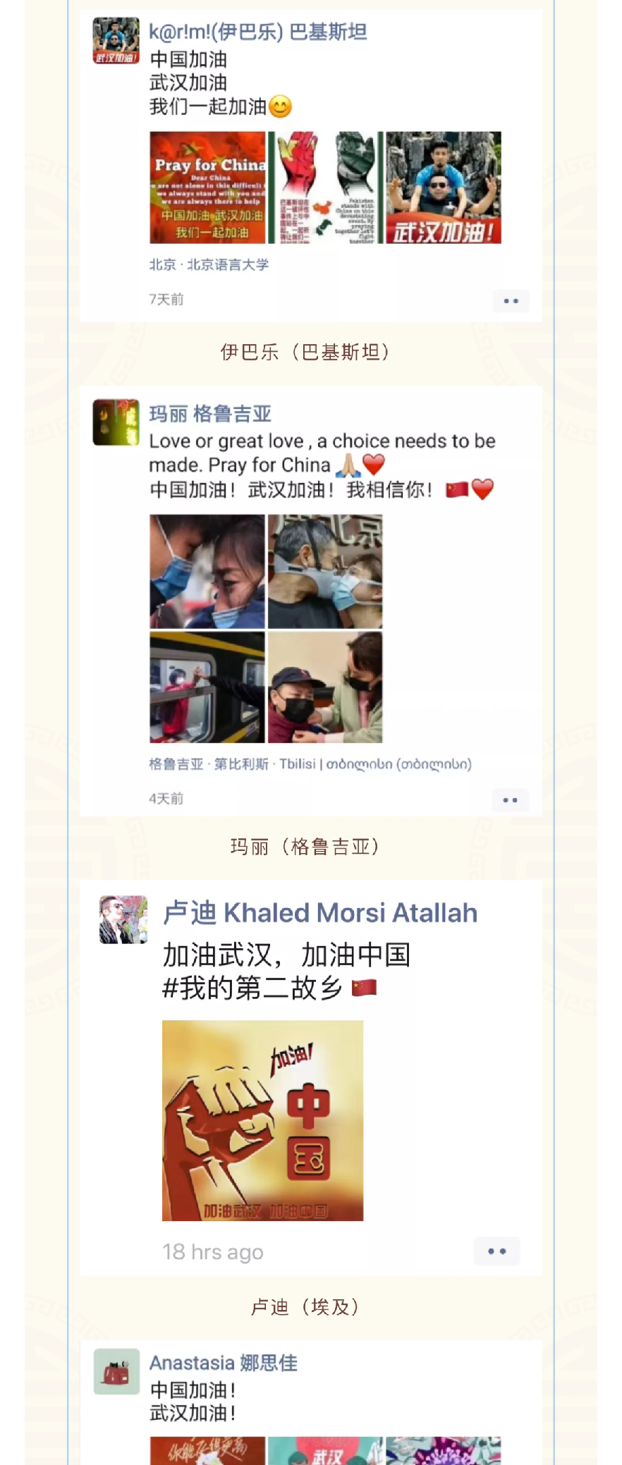 大爱无疆,疫情无情人有情,国际学生和海外校友的理解支持和声援帮助,更加坚定了学校打赢此次疫情防控战的信心和决心。我们用心行动,我们用爱关怀,愿大家与时刻牵挂着你们的老师们携手向前,共同迎接战“疫”的最终胜利!