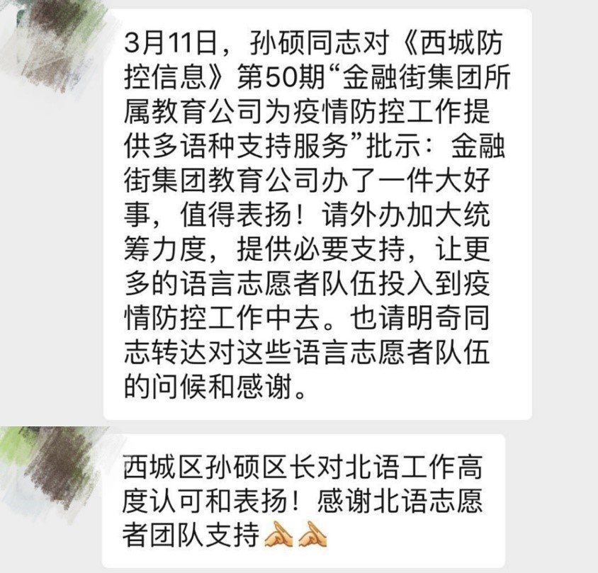 我校志愿者以耐心的服务态度、专业的工作技能得到了西城区各方防疫工作者的大力肯定,相关部门对我校志愿者团队表达了问候和感谢,其中,西城区孙硕区长在此项目的官方媒体报道《西城防控信息》中,表示了对北语工作的高度认可和表扬,同时鼓励加大统筹力度,提供必要支持,让更多的语言志愿者投入到疫情防控的工作中去。
