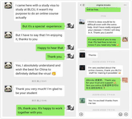 4月13日,“汉语速成在线”第一天的课程结束以后,很多学生在班级微信群自发留言,表达对线上直播汉语课和对老师们的喜爱和认可。“汉语速成在线”的成功开课标志着汉语速成学院的线上教学迈出了艰难但坚实的第一步。学院将以此为契机,积极探索符合线上教学特点的汉语速成教学新模式与新方法,确保线上教学与线下教学同质同优,不断提升在线上汉语教学领域新的影响力。目前学院正在第一轮开班的基础上,着手准备第二轮的招生,争取实现更大的突破。
