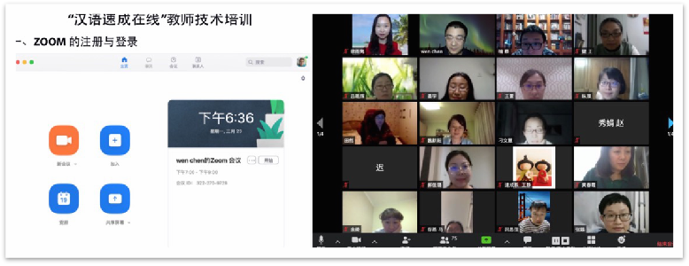 学院当即成立“汉语速成在线”教学筹备组,院领导迟兰英、苏英霞作为总负责人,组织有关人员对线上教学进行总体研究、总体策划,明确线上教学的总目标,即充分发挥学院40余年积累的教学优势,确保线上教学与线下教学同质同优。在课程设置方面,最大限度地满足不同时区学生的学习需求,开设晚上班。教学筹备组还就线上教学平台开展了广泛的调研,与国内外多家院校和教育机构取得联系,详细了解不同国家和地区开展线上教学的情况,并对各种直播软件进行反复比较,最终确定了使用ZOOM视频会议软件作为授课平台,所有的课程以直播的方式开展。教学方案确定后,立即投入招生宣传。为保障招生工作顺利开展,吸引更多的生源,学院又迅速成立了招生宣传工作组、分班测试小组、试听课小组和试听课保障小组,20多位老师参与其中。为更好地宣传,学院组织人力自制了招生宣传片并对试听课进行精心设计。与此同时,为帮助大家尽快掌握线上教学的相关技术,学院还专门组织了两场线上教学的技术培训。随后,老师们以教研室为单位,互为师生,开始了线上教学“大练兵”。时间紧,任务急,四个工作小组和全体教师全力以赴,加班加点,经常工作到深夜,大家相互帮助,密切配合,确保线上教学前期的各项准备工作保质保量地完成。