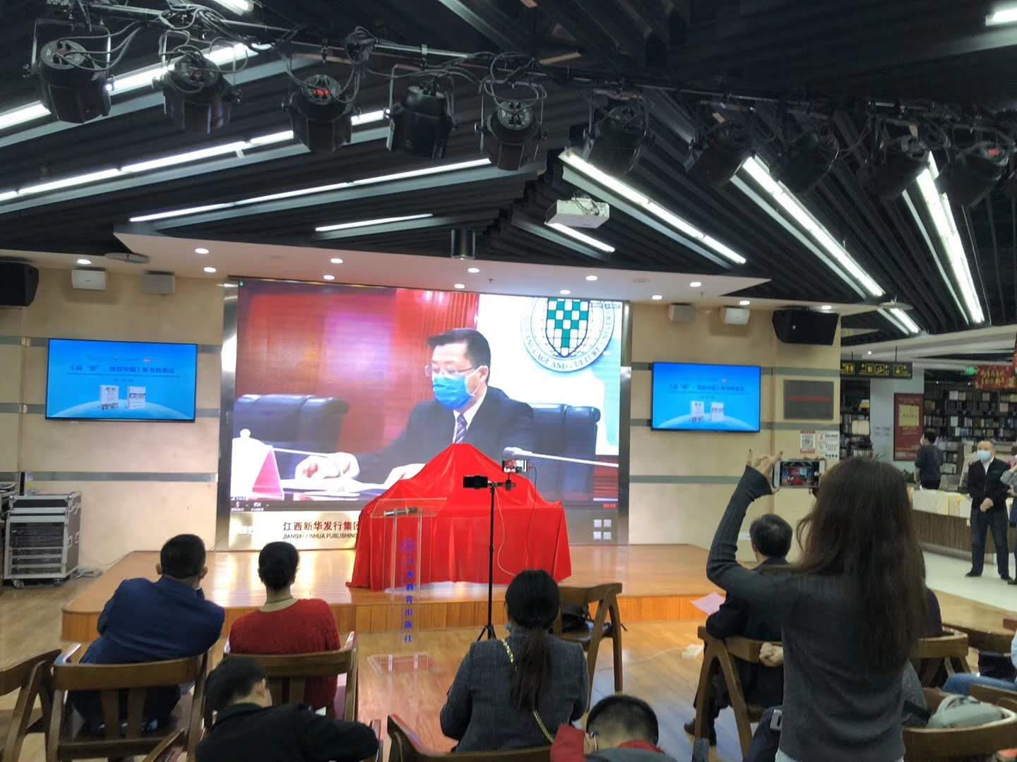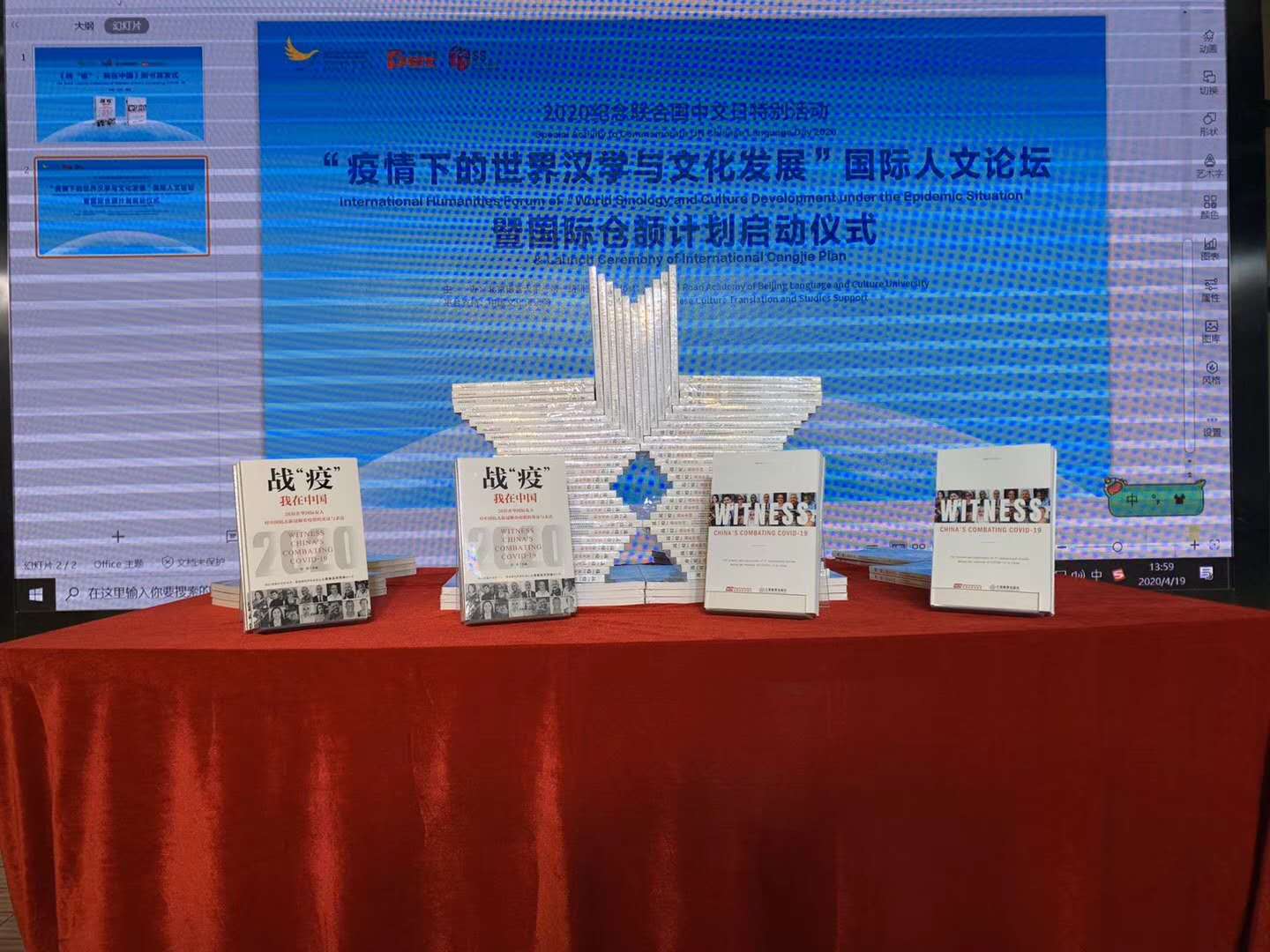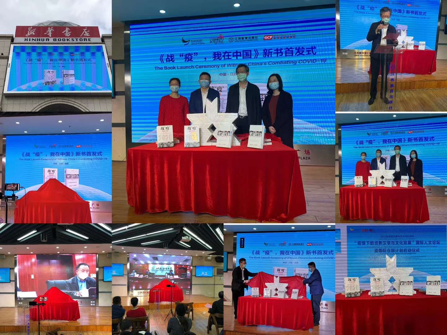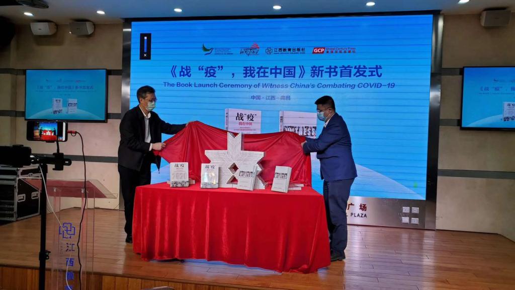 活动现场,北京语言大学校长刘利正式启动“国际仓颉在线——全球中文信息共享云平台”向全球97国的700名汉学家和140国的5000名北语留学生赠送10册中外文防疫书籍。北京语言大学副校长张宝钧面向北语20万海外校友和140余国留学生及汉学家发布了“国际仓颉计划倡议”。由北京语言大学一带一路研究院与英国全球世纪出版社及江西教育出版社依托中国文化译研网(CCTSS)国家工程平台联合制作、北京语言大学校长刘利担任主编的,由37位国际友人共同创作的《战“疫”,我在中国》(英文版)——WITNESS CHINA’S COMBATING COVID-19在英国正式出版,中文天地出版传媒股份有限公司总编辑游道勤与江西教育出版廖晓勇社长为新书揭幕。