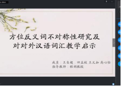 由于疫情影响的特殊原因,本次结项答辩会采取了线上答辩会议的形式。本次共有5个国家级项目、7个校级项目参与答辩,各项目组的负责人在6分钟内向评委展示了项目研究成果,采用PPT的形式进行答辩。评委根据负责人的汇报内容有针对性地提出建议、抛出问题,并从项目报告与答辩、项目完成情况、项目成效、学术规范性四个方面对项目进行评议。《方位反义词不对称性研究及对对外汉语词汇教学的启示》项目得到在座评审老师的一致好评,荣获优秀项目称号。