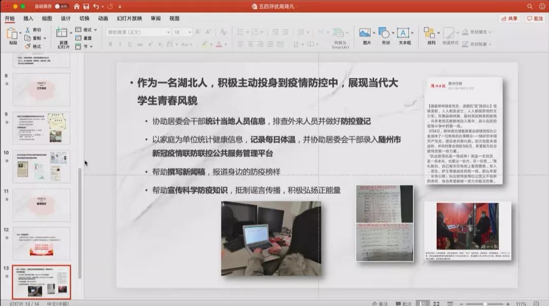 优秀团员的评选中,很多同学都精心准备了PPT,来自16英翻的葛根塔娜、18多语的朱琳等同学分享了她们的志愿经验,值得一提的是,由于处于特殊时期,许多同学也投身到了抗疫志愿者的行列中,来自18英翻的赵倩琳、19本地化的王琛、16本地化的周琦凡等同学用切身经验告诉我们,作为新时代的大学生能为抗疫做些什么。紧接着是优秀团干部的评选,团组织作为党的助手和后备军,发挥团干部骨干与核心作用尤为重要,来自19英翻的赵昱祺、19多语的江楠等同学分享了组织班团建设必不可少的经验,18本地化的王嘉欣、18多语的杨晨曦等同学介绍了作为团总支部长的工作经验。