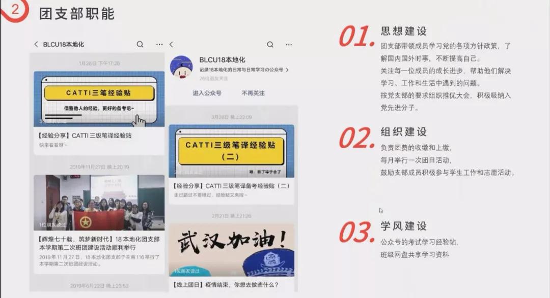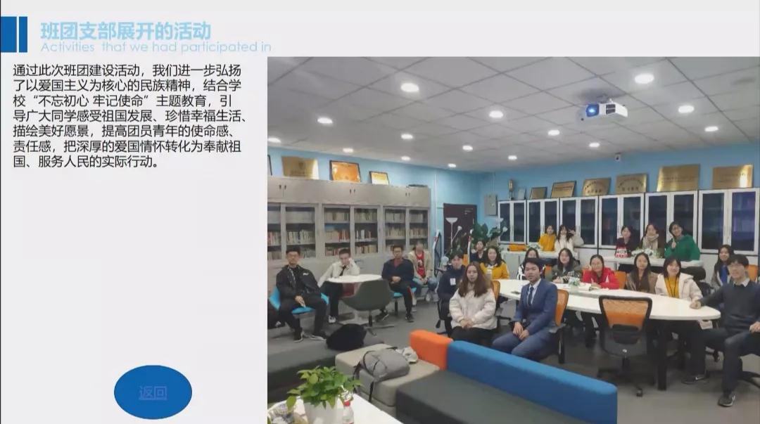 最后,优秀团支部候选支部代表向我们展示了各个团支部的具体情况,回顾各月活动,分享感悟与反思。19本地化主打创意与情怀,其组织的团日活动多样性令人印象深刻;18本地化则具体讲解了思想建设、组织建设、学风建设等方面的内容,逻辑严密,有理有序。