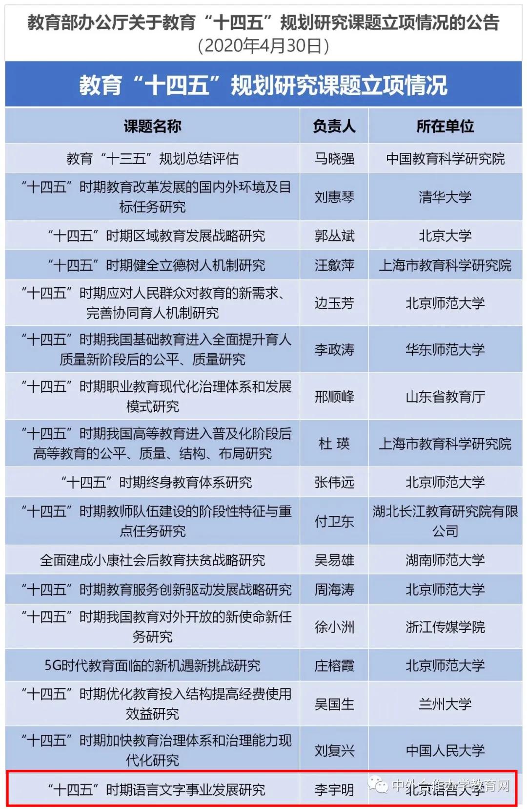 近日,教育部发布了《教育部办公厅关于教育“十四五”规划研究课题立项情况的公告》。为科学开展教育事业发展“十四五”规划编制工作,教育部前期组织开展了教育“十四五”规划研究课题的申报工作,一批专家学者踊跃申报,提交了众多高质量的课题申报材料,经评审,共有9所高校,17项课题获批立项。我校李宇明教授的“‘十四五’时期语言文字事业发展研究”课题获批立项。
