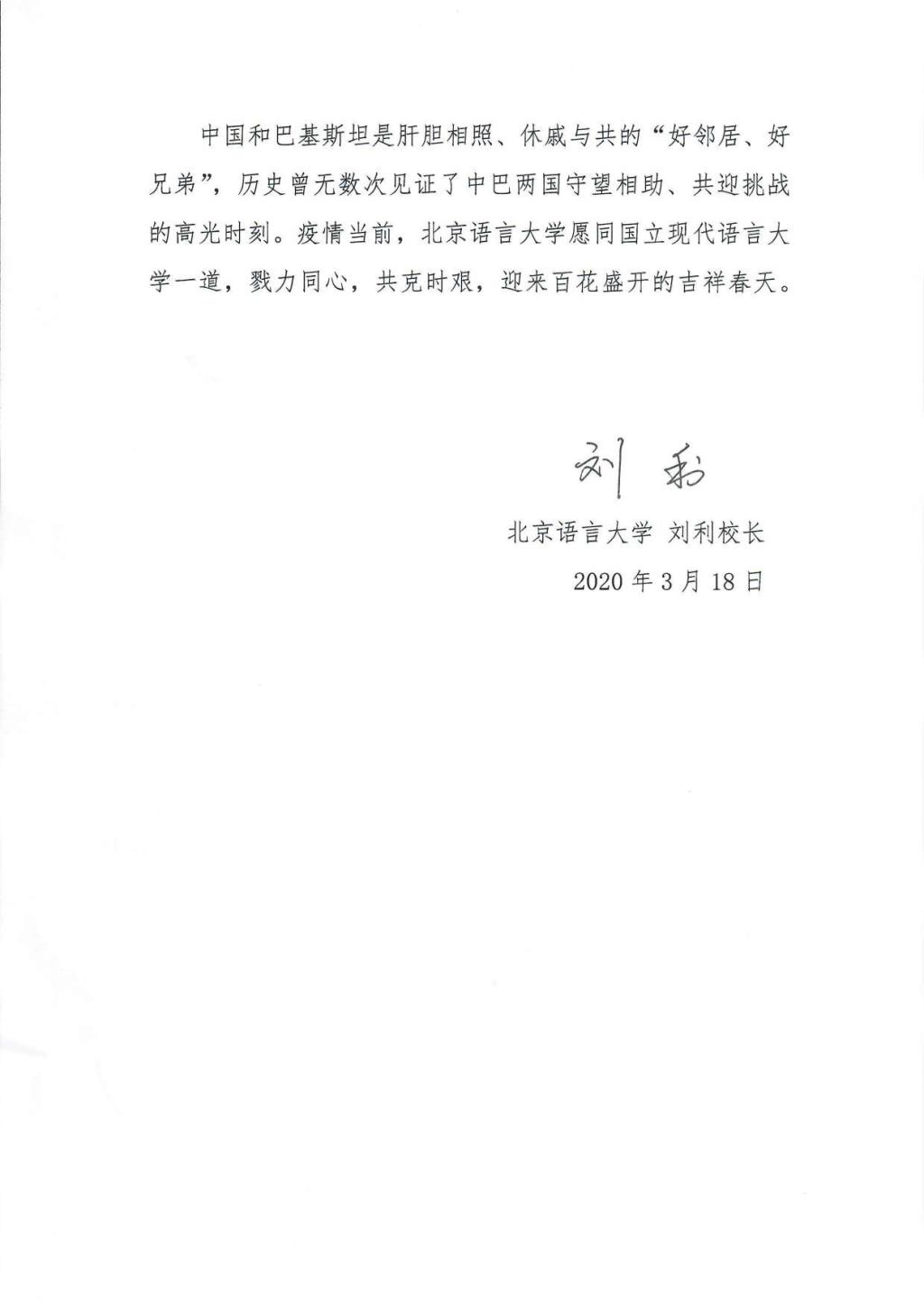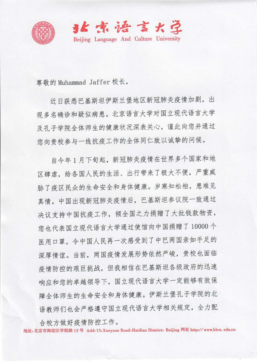 中国和巴基斯坦山水相连,唇齿相依,是肝胆相照的信义之交,也是休戚与共的患难之交。伊斯兰堡孔子学院正是两国“比山高,比海深,比蜜甜”友谊的代表者、见证者和传承者。在巴基斯坦疫情爆发之初,北京语言大学校长刘利就曾致信国立现代语言大学Muhammad Jaffer校长,感谢国立现代语言大学倾全国之力捐赠大批钱款物资支持中国的抗疫工作,现在巴基斯坦也面临着疫情防控的重要挑战,他期望中巴两国能守望相助,北京语言大学将与国立现代语言大学一道,戮力同心,全力打好这场疫情阻击战。