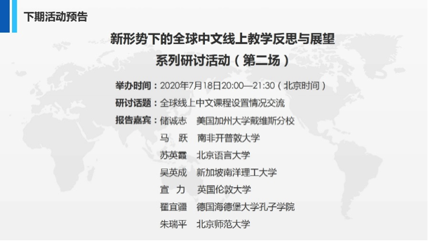 “全球中文教学线上交流平台”的系列研讨会将采取邀请和报名相结合的方式聘请报告嘉宾,定期邀请学界同人就大家关心的问题进行研讨,分享高见。平台试行新的会议组织形式,开短会,说短话,以便给更多的同行提供发表真知灼见的机会。近几期研讨将聚焦全球中文教学共同关注的线上中文教学问题。我们将邀请世界各地同行介绍各国、各校的线上教学情况、经验、方法、资源、工具、遇到的问题等等。除邀请专家外,平台还将从报名发言的老师中邀请部分发言者,正在策划的研讨话题包括:非洲汉语教学专题、欧洲汉语教学专题、线上线下课堂教学演示等。