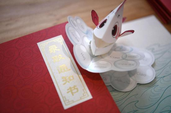 办公桌上最显眼的是红彤彤的新版录取通知书。它由北语在校生设计,其设计理念为“无余质朴,内敛柔和”;外封采用了传统信笺的制式,覆以红色祥云纹致以问候;内页根据纸模工艺对北语的吉祥物“宝贝鱼”进行了3D设计,打开通知书,立体的“宝贝鱼”造型跃然纸上;值得一提的是,通知书内页下方的每个气泡图案中印有不同国家语言的“你好”二字,突出北语“小联合国”的文化交融;背后的水波纹样取自宋代知名画家马远的《水图》,寓意迎接未来的北语学子在知识的海洋中探索、遨游和跳跃。