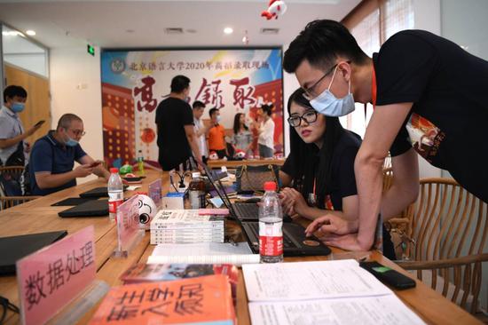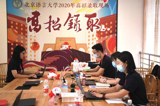北语今年高招录取现场设在会议中心二层,办公现场分为组长、检录1组、检录2组、检录3组、银行卡、数据处理等不同岗位,6位穿着文化衫的工作人员对着电脑紧张核对信息。