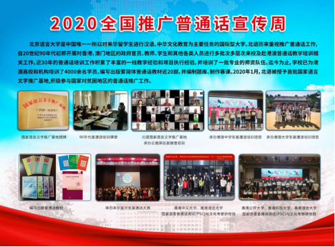 服务国家需要,是北京语言大学建校以来一脉相承的优良传统。自20世纪90年代开始北语就开展了对香港、澳门地区的政府官员、教师、学生进行多批次的普通话教学培训工作。迄今为止,学校已为港澳高校和机构培训了4000余名学员,积累了丰富的普通话教学和培训经验,培养了一批专业的师资队伍,编写出版了繁简体普通话教材近20部。2020年1月,北语被授予首批国家语言文字推广基地,积极参与国家对贫困地区的普通话推广工作。