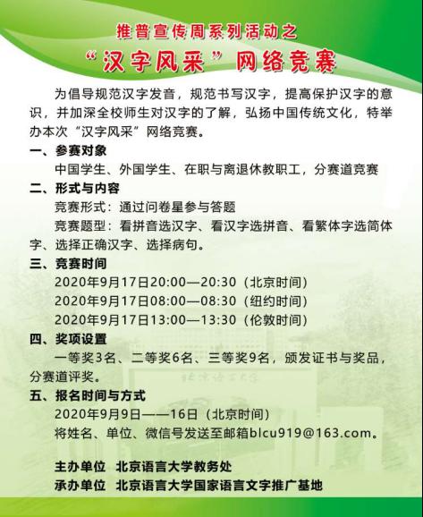 今年9月第三周是第23届全国推广普通话宣传周,主题为“同讲普通话·携手进小康”。经过积极筹备,9月14日,由北京语言大学教务处主办、北京语言大学国家语言文字推广基地承办的北京语言大学推普周已正式拉开序幕。推普周期间,一系列丰富多彩的活动陆续亮相。
