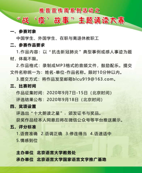 为提高规范正确使用普通话的能力,用语言表达艺术的风采,歌颂“抗击新冠肺炎”的典型楷模,我们将以“战‘疫’”中的典型事例或感人事迹为题材,组织全校师生进行诵读大赛。在规定时间内征集录音作品,并评选出“十大朗读之星”。