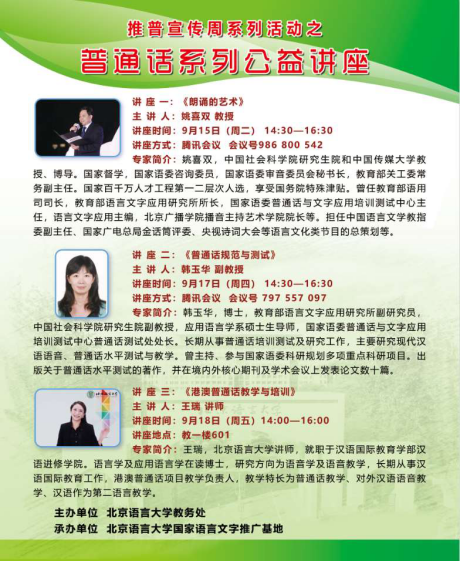 为深入推进国家通用语言文字的规范和普及,提高全民语言表达能力与相关行业普通话应用能力,9月15至18日推普周期间,我们还将推出三场线上线下的普通话系列公益讲座。分别为:中国社会科学院研究生院和中国传媒大学姚喜双教授主讲的《朗诵的艺术》、教育部语言文字应用研究所韩玉华副研究员主讲的《普通话规范与测试》以及北京语言大学汉语进修学院王瑞老师主讲的《港澳普通话教学与培训》。