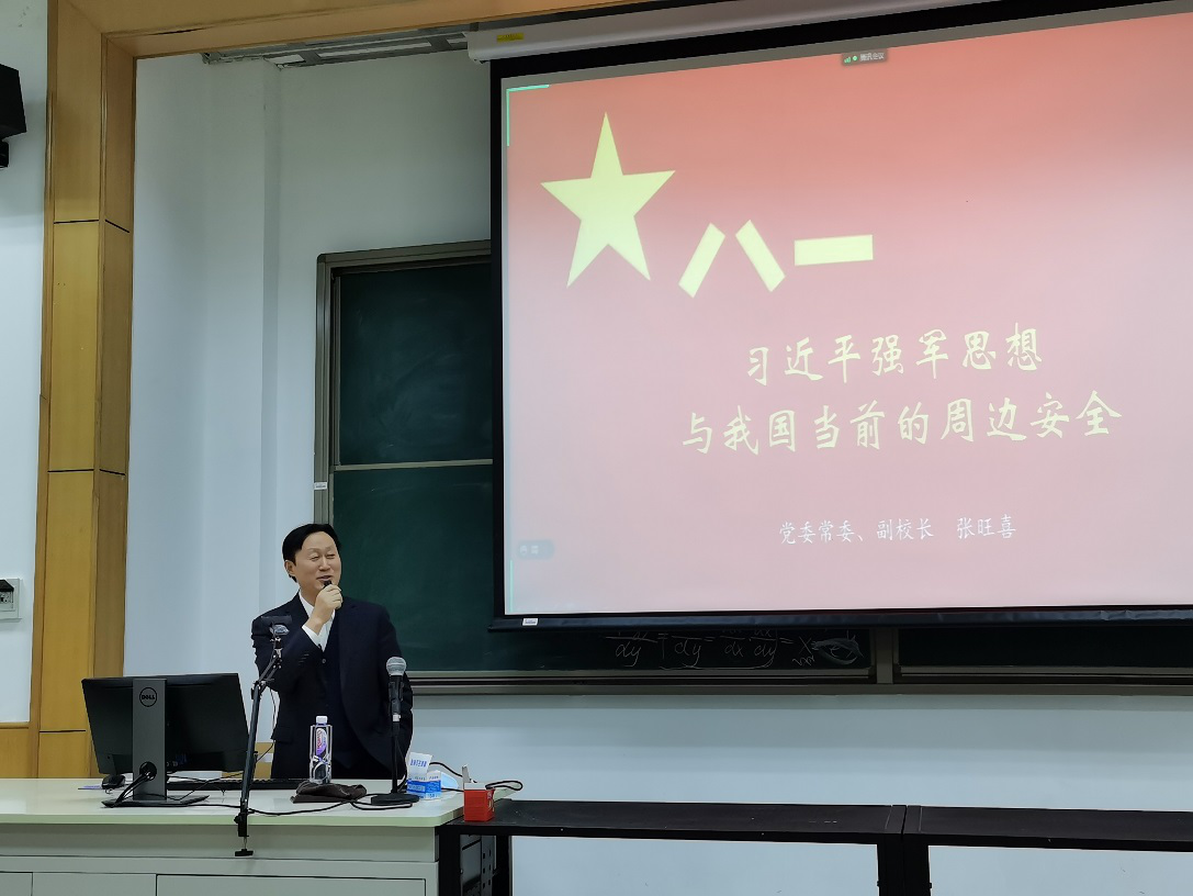 10月22日下午,校党委常委、副校长张旺喜教授走进我校博士生“中国马克思主义与当代”课堂,上了一堂题为《习近平强军思想与我国当前的周边安全》的思政课。张旺喜副校长从政治建军、科技强军、改革兴军、依法治军四个侧面,为同学们讲授了习近平建设世界一流军队的强军思想理论及其伟大实践,并为同学们梳理了我国当前的周边安全态势,强调要以习近平强军思想指导并应对我国周边安全的复杂、凶险的局势。