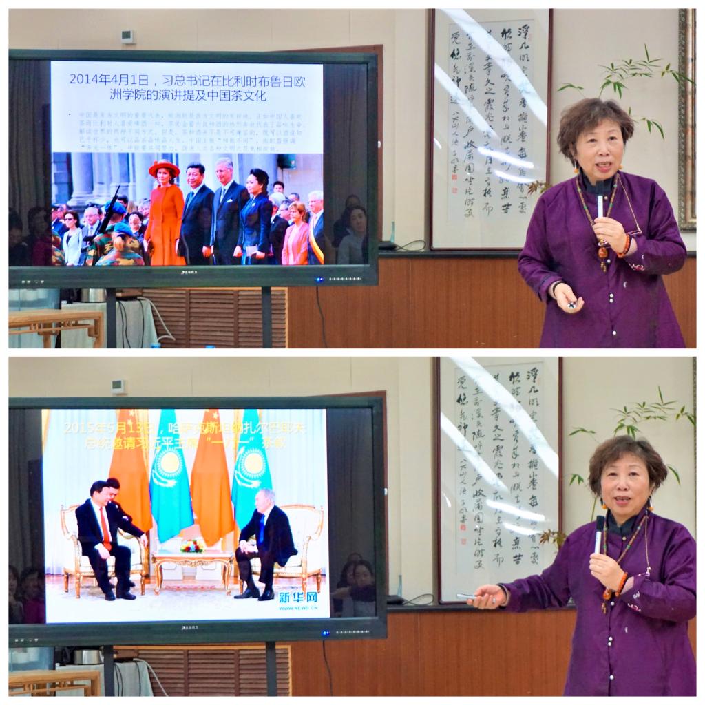 两场创意茶席展示之后,王旭烽教授以其广阔的视域、渊博的学识和详实的史料为大家带来了《青枝绿叶走天涯——中国茶的国际交流》的精彩讲座。她以习近平主席的茶叙外交为开篇,娓娓道来近年来茶在中国外交舞台上所具有的独特魅力和发挥的重要作用。随后,王教授为大家徐徐展开了一幅历史画卷,介绍了从古至今,茶由中国走向海外,走向全世界的历程以及茶在各国传入、发展和演化的历史,揭示了千百年来,茶作为文化交流的使者,在中国与其他各国的国家外交与民间外交中,在人们的生活、内心和人格的养成,以及社会上人与人之间的交往中都具有极其重要的意义。可以说,发源于中国的茶,为促进世界各国民心相通、文明互鉴起到了独特而巨大的作用。讲座的最后,王旭烽教授指出,习近平主席的茶叙外交,把茶文化作为中国文化符号来与世界进行对话交流。茶不是简单的农产品,而是知识经济,是中国文化软实力。因此,我们要大力弘扬中国茶文化,“把世界铺成一张茶席,让全人类在此共饮”。