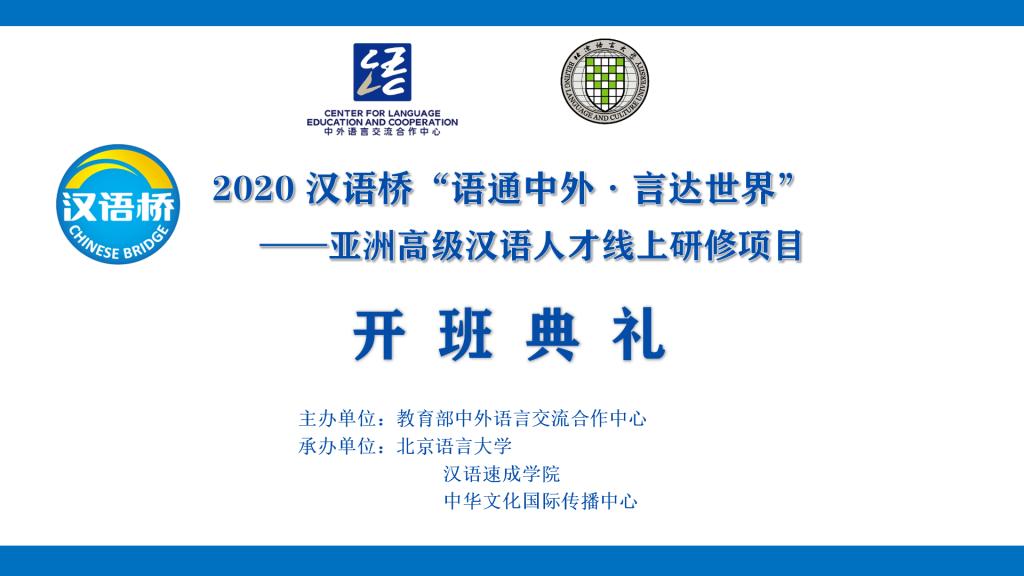 亚洲高级汉语人才线上研修班是中外语言合作交流中心主办的2020“汉语桥”线上团组中的首开项目之一。作为承办单位,汉语速成学院与中华文化国际传播中心将发挥北语的优势,办出特色,办出水平,为“汉语桥”线上系列项目贡献北语力量,为推动中国与世界各国的文化交流与文明互鉴做出贡献。