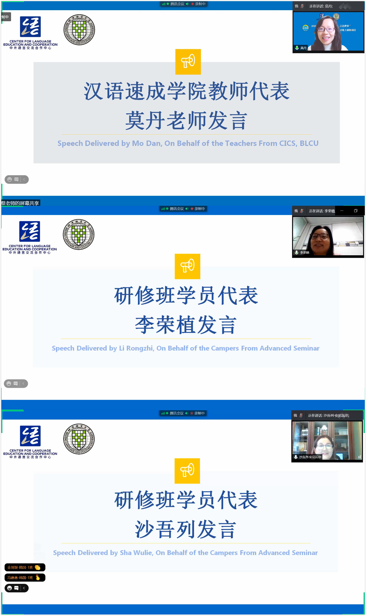 来自韩国的李荣植和来自哈萨克斯坦的沙吾列作为学员代表先后发言,二位代表首先对语合中心和北京语言大学为大家提供这么宝贵的深入学习汉语和了解中华文化的机会表示衷心感谢。李荣植表示,这个项目为各国汉语教师提供了提升自我能力的机会,有助于大家今后更好地传播汉语言文化,真正发挥沟通不同文化的桥梁的作用。沙吾列从事汉语教学30余年,深爱这个职业,她说:“疫情阻挡不了大家教汉语的积极性,她的愿望就是要把自己的知识传授给更多的学生。”
