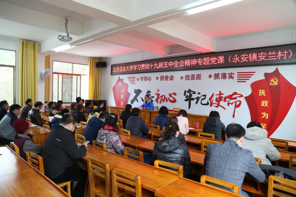 11月30日上午,调研组一行前往永安镇安兰村调研,看望慰问我校挂职安兰村驻村第一书记刘振宇,实地考察了安兰村新村部。魏晖副书记为安兰村部分党员群众讲授了学习贯彻党的十九届五中全会精神专题党课。之后前往安兰小学调研,举行了北京语言大学“爱心书屋”捐赠仪式,为学生捐赠图书和文具。下午前往隆福乡大崇小学,调研北语师生援建的教学楼建设使用情况。当天还调研了永安镇澳寒羊养殖基地、大都华牛生态养殖科技示范园和都安西南冷链仓储物流中心。