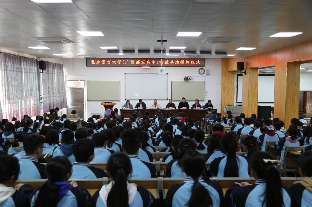 下午,调研组前往都安高中进行调研,举行了北京语言大学(广西都安高中)实践基地授牌仪式,双方团委签订了合作协议。学校一带一路研究院副院长黄悦为都安高中200余名师生做了“技术助力梦想,文化点亮未来”的北语名师进课堂宣讲。当天,还调研了八仙易地扶贫搬迁安置新区扶贫车间、八仙新料屯由北语和中国矿业大学(北京)共同援建的蔬菜基地等。