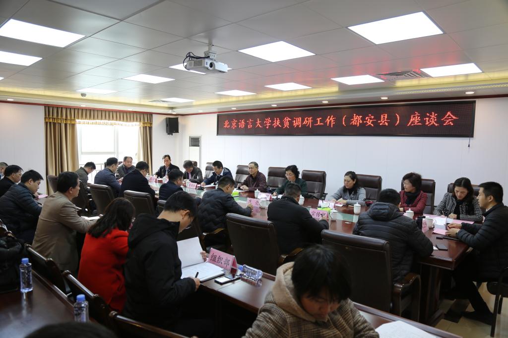12月1日上午,北京语言大学定点帮扶都安县工作座谈会在都安县政府五楼会议室召开。座谈会由都安县委副书记、县长蓝如帅主持。都安县委常委、副县长王庆多和我校挂职副县长王亮以及县政府办、组织部、宣传部、财政局、扶贫办、教育局、工信商务局、文旅局等部门负责人参加。蓝如帅县长介绍了都安今年脱贫摘帽情况,并对北京语言大学一直以来在教育发展、产业扶持、社会帮扶、基础设施建设等方面给予都安的大力支持表示衷心感谢。蓝如帅表示,都安的脱贫摘帽只是一个阶段性的胜利,后续还需要不断巩固脱贫成果、增强造血能力,这需要强有力的智力支撑,希望北语为都安发展提供更多支持和帮助。