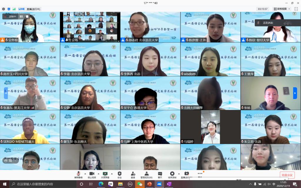 12月19日,由北京语言大学语言认知科学学科创新引智基地研究生会主办的第一届语言认知科学研究生学术论坛举行。来自北京、上海、香港、澳门等17个省、市、自治区76所高校的近300名博士生、硕士生以现场和线上的方式参加了本届论坛。