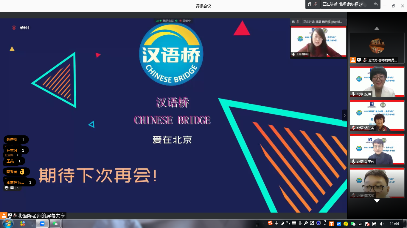 迟兰英主任、赵秀娟副院长和朱子仪副主任为3个班的营员颁发了学习证明。师生们互相说着告别的话,大家都依依不舍。这与其说是一个结束,不如说是一个新的开始。老师们向营员们发出了疫情过去后到北语汉语速成学院继续学习的邀请,营员们纷纷表示要继续坚持学习汉语,绝对不会放弃,他们对将来在北语的学习和以后由北语汉语速成学院举办的线上项目充满期待。