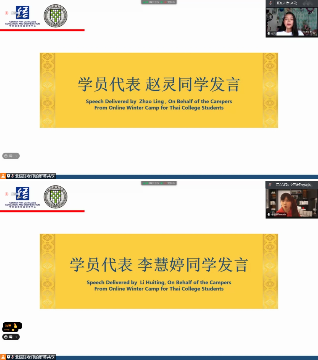 营员代表李慧婷同学提到她和许多同学一样,在学习冬令营课程的同时还在上大学的课,但她喜欢学中文,每次学习中文她都很开心,虽然忙得几乎没有放松的时间,但她乐此不疲,因为北语的冬令营课程不仅能提高她的汉语水平,也使她对中国有了深刻的了解。赵灵同学用“突飞猛进”来形容这次冬令营给营员们带来的变化,让他们对中国有了更多的了解;她觉得无论是商务汉语课还是文化讲座和文化体验活动都很有用,不仅学到了很多知识,还使学生们有机会接触到了地地道道的中国传统和当代文化;尤其是商务汉语课,这门课的内容虽然有点难,但是教的内容都是实用的,而且老师讲解得非常容易懂,特别吸引人。她希望,未来有机会要到北京语言大学来学习,实地接触真正的中国社会和当代文化,或者在网络上能再有机会参加北语的在线课程。许多营员表示这次“汉语桥”线上冬令营是一次可遇不可求的机会,给大家留下了深刻的印象。