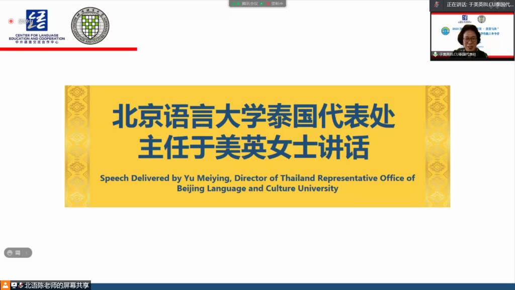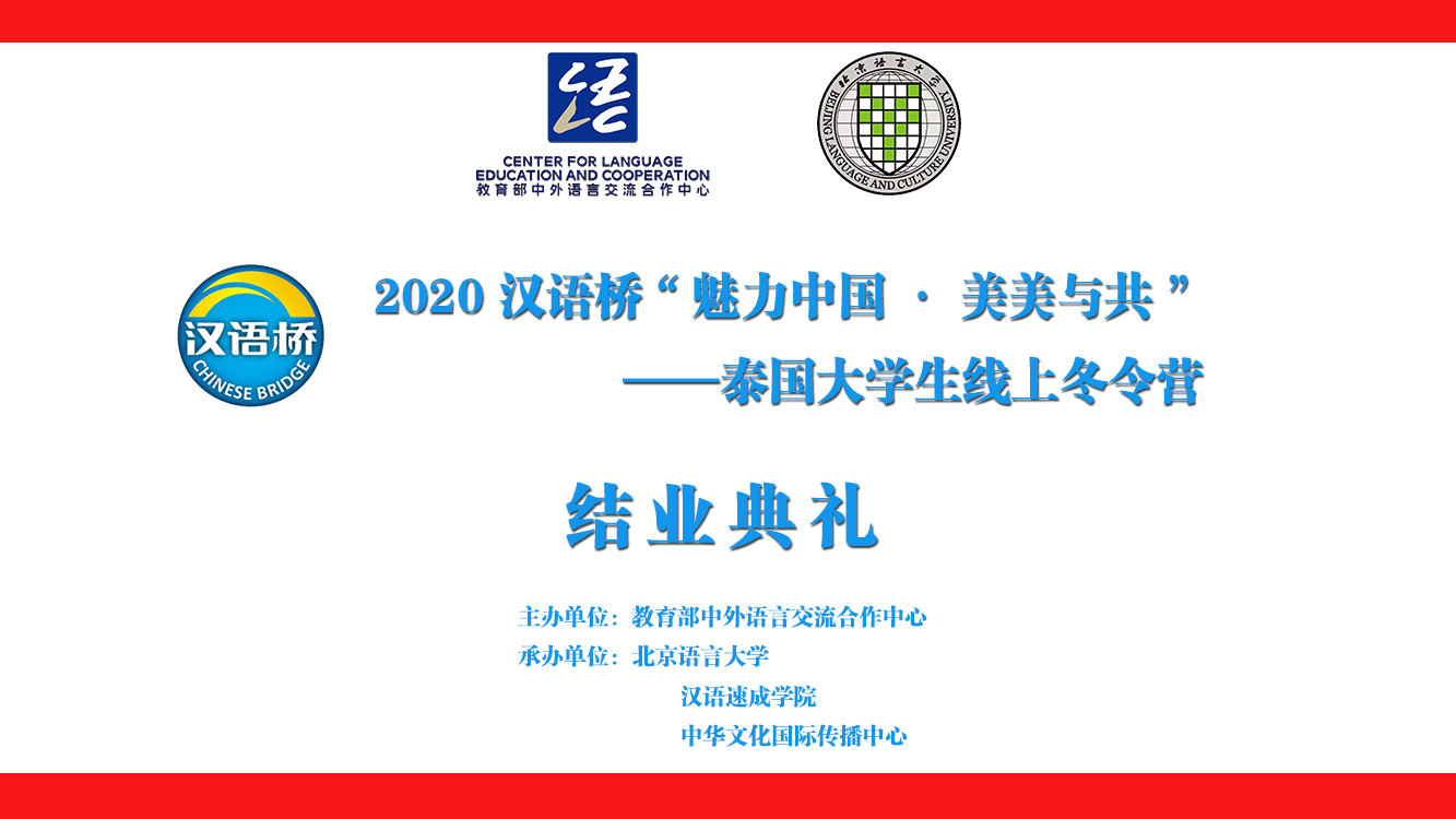 12月26日上午,2020 汉语桥“魅力中国,美美与共”——泰国大学生线上冬令营举行了闭营仪式。北京语言大学中华文化国际传播中心主任迟兰英、北京语言大学泰国代表处主任于美英、国际学生招生处处长周鑫、项目组教师,以及泰国的营员们在线上参加了结业典礼。