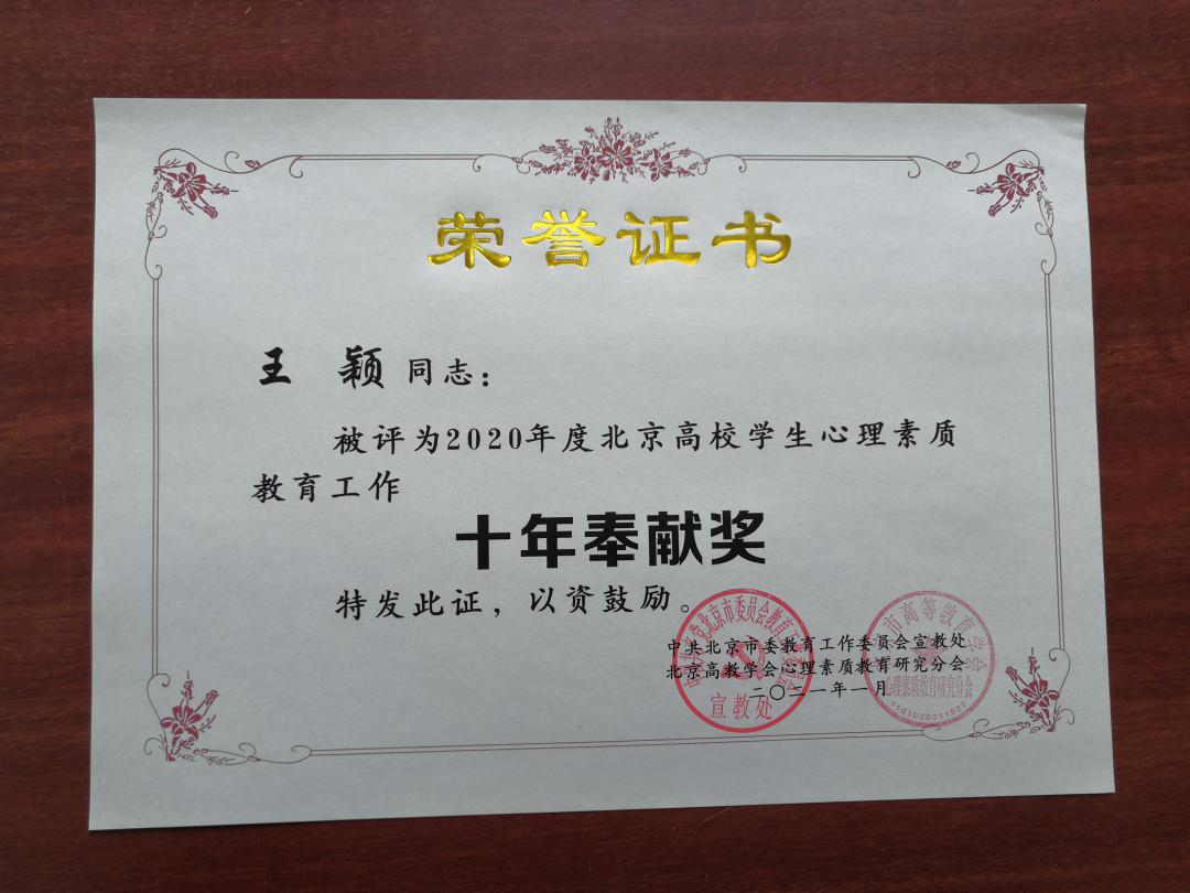 1月14日至15日,由中共北京市委教育工作委员会宣教处与北京市高等教育学会心理素质教育研究分会共同举办的北京市高等教育学会心理素质教育研究分会年会暨京沪高校心理健康教育高峰论坛在线上举行。会议表彰了2020-2021年北京高校学生心理素质教育工作的集体奖与个人奖,北京语言大学学生心理咨询中心荣获“特色工作”奖、中心负责人王颖老师荣获“十年奉献奖”,这是我校连续5年获得集体奖。