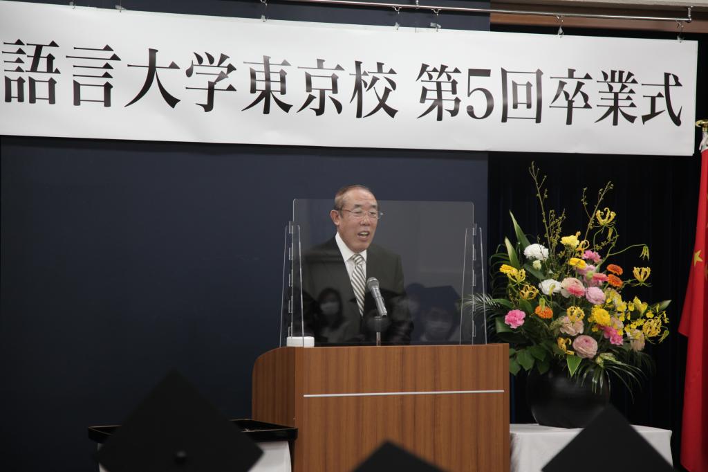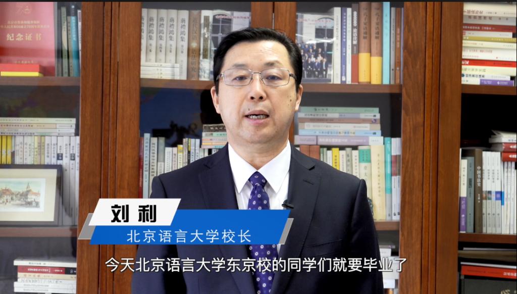 北京语言大学校长刘利教授特为本次毕业典礼发来了视频祝辞,向东京学院毕业生表示衷心祝贺。刘利校长在致辞中说,本届27名毕业生是东京学院建校5年来毕业生人数最多的一届,你们都是优秀的学生。你们毕业了,现在正站在人生最重要的路口和旅途的新起点上,即将去创造属于自己的未来。希望你们在今后的生活中,永远秉承好学之心,既要与好书为伴,更要善读人生这本无字之书。不要放弃对真善美的追求,怀有好奇之心,不惧怕未知的世界,脚踏实地,去感受人生的多种可能性。刘校长指出,毕业不是学习的终结,而是新的学习的开始。希望同学们保持不断学习和思考的热情,不断探求新知,追求真理。步入社会后,勇敢面对更多的考验,常存敢为天下先的勇气、永不言败的锐气和积极进取的朝气,为促进各国民心相通、推动构建人类命运共同体做出自己的贡献。