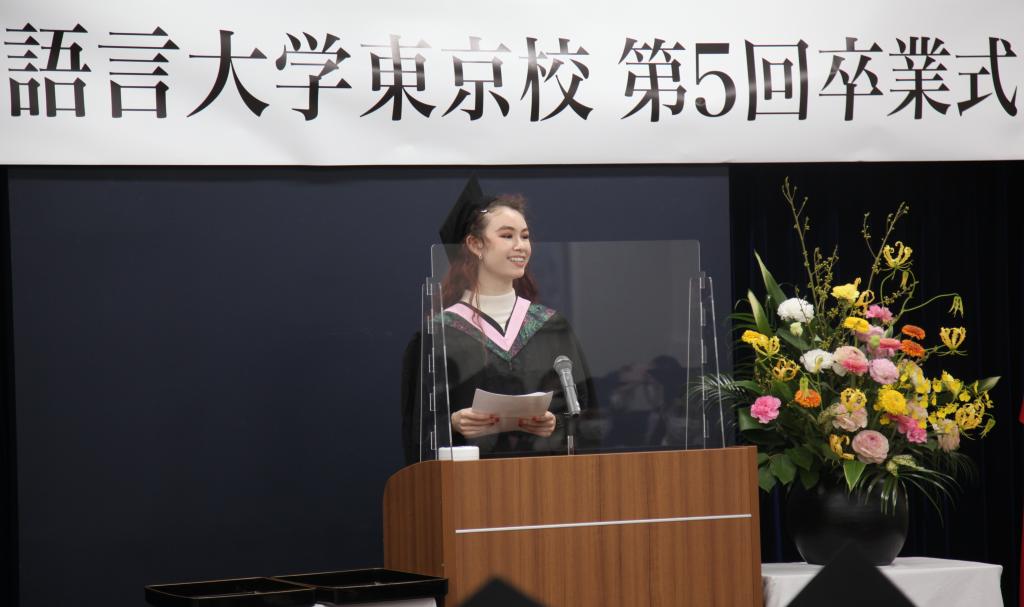 毕业生代表在毕业感言中回忆了在东京学院四年的学习历程,衷心感谢学校和全校教职员的辛勤培养和教育。