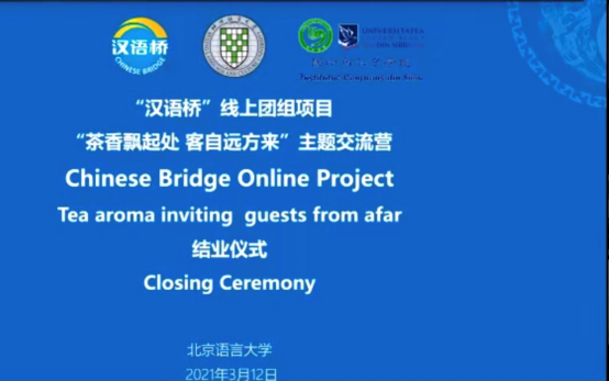 3月12日,由中外语言交流合作中心支持、北京语言大学承办、罗马尼亚锡比乌卢奇安·布拉卡大学孔子学院协办的“汉语桥”线上团组项目“茶香飘起处,客自远方来”文化主题交流营举行了结业仪式。北京语言大学孔子学院事业部中国文化海外传播中心主任邱萍女士、罗马尼亚锡比乌卢奇安·布拉卡大学孔子学院中方院长王囧女士、以及项目组成员和来自罗马尼亚锡比乌孔子学院的师生们一起在线参加了本次结业。
