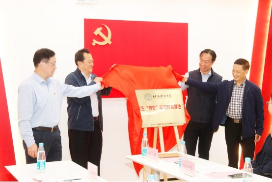倪海东书记、黄益方副校长和教育部党史学习教育高校第三巡回指导组方国良副组长、范迅副组长一起为学生“四史”学习教育基地揭牌。