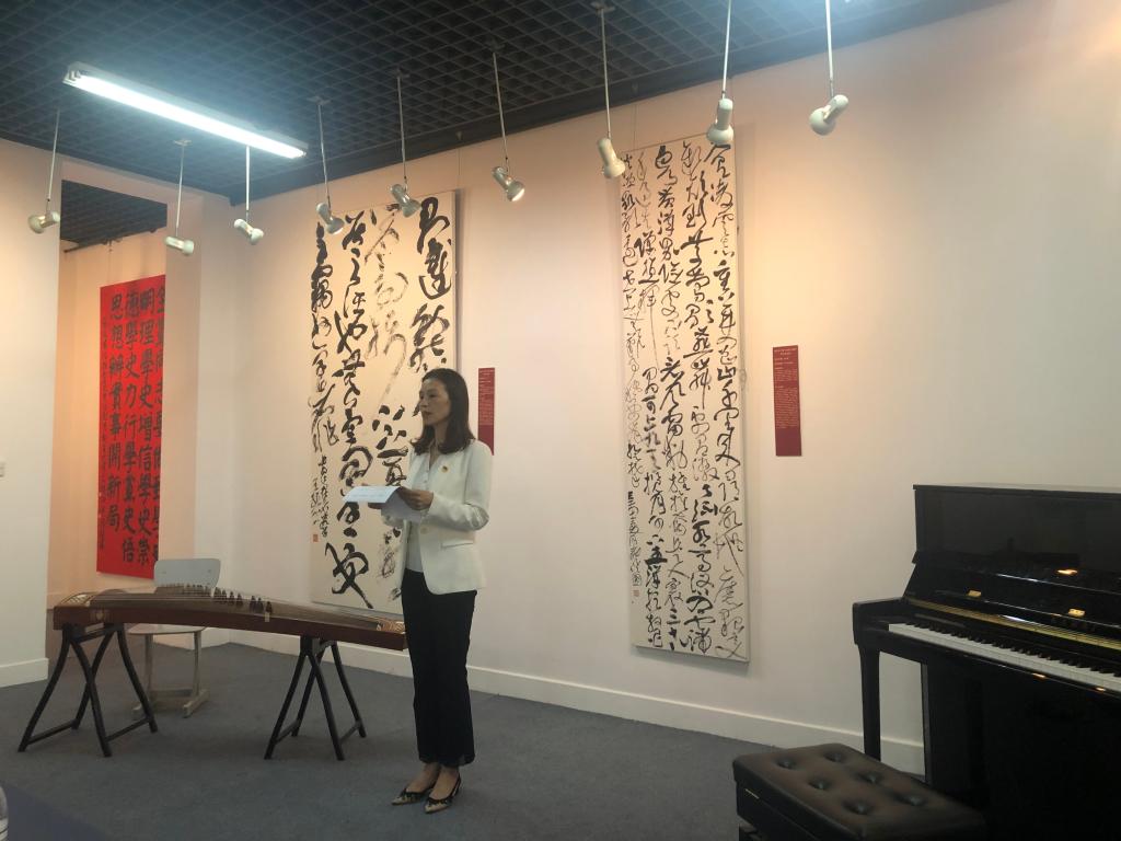 艺术学院党总支书记陈霞向参加书法展开幕式的领导、师生表示热烈欢迎与诚挚感谢。她说,自党史学习教育开展以来,艺术学院党总支认真策划,精心组织,围绕“学党史,悟思想、办实事、开新局”的目标,通过打开画卷学党史、学唱红歌悟思想、书写经典传文化等形式,让党史学习与师生的专业有机融合起来,引领全院师生党员“以美育人,经典铸魂”,让党史学习进一步入脑入心,走深走实。今天我们在此举办的”习总书记用典草书作品展”,就是书法专业师生结合党史学习一次理论到实践的展示。她还分享了学习习总书记讲话用典的心得体会,让我们深刻感受到习总书记的语言朴实亲切、妙趣横生、意味深长。她预祝此次草书作品展圆满成功。